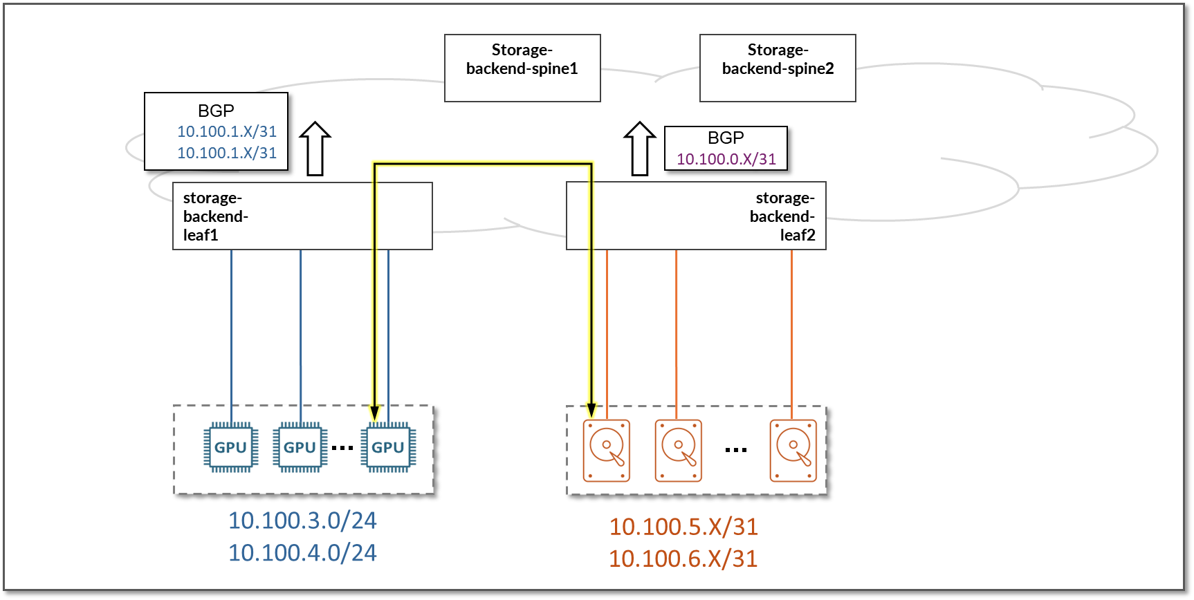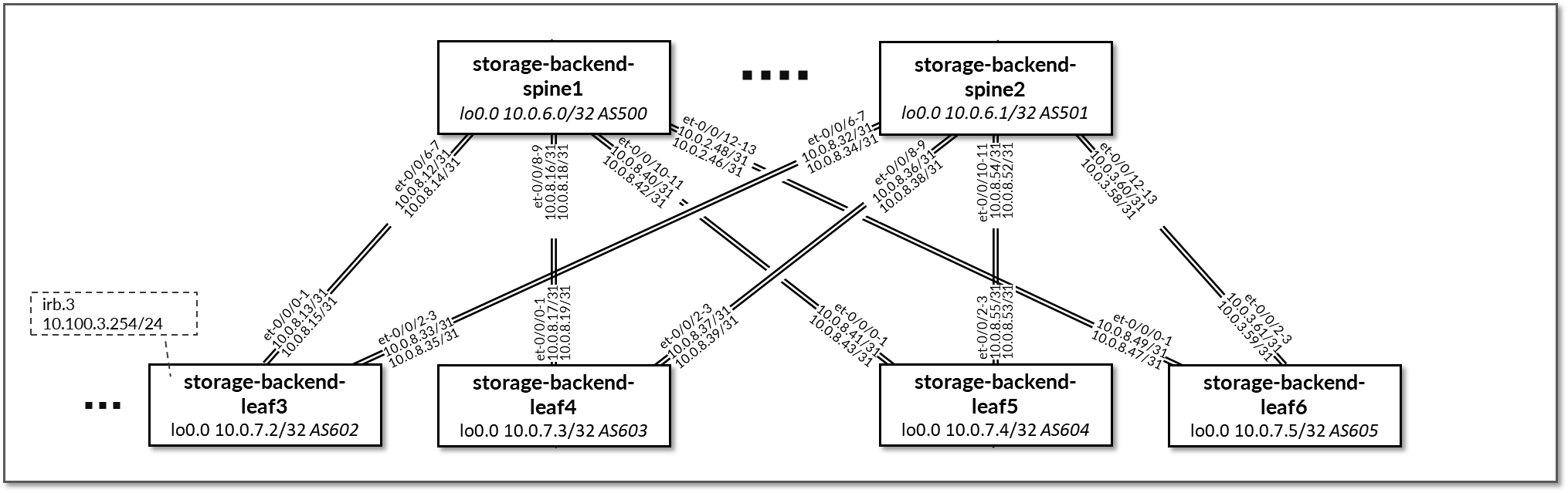 - storage-backend-leaf# nodes to storage-backend-spine# interfaces subnets