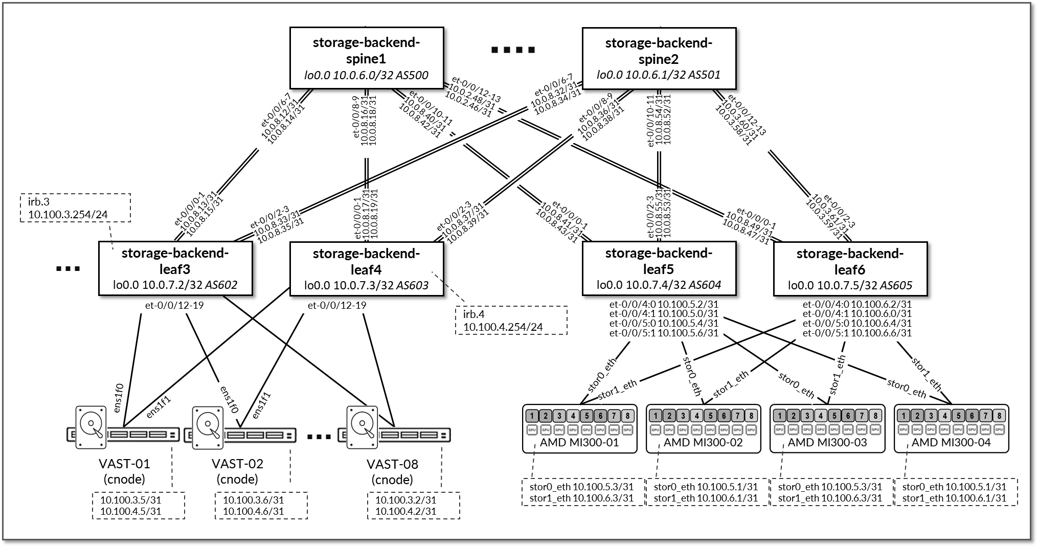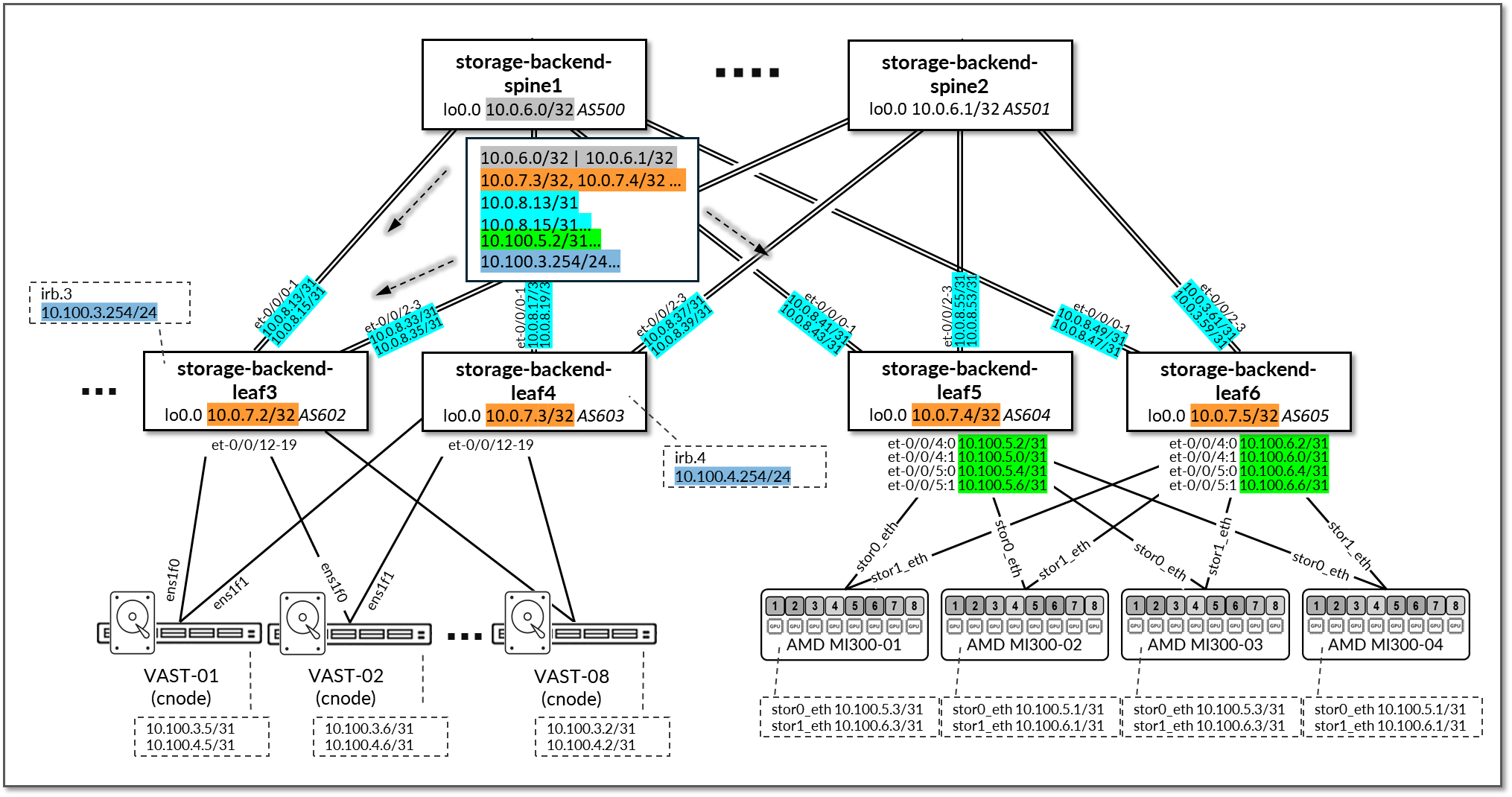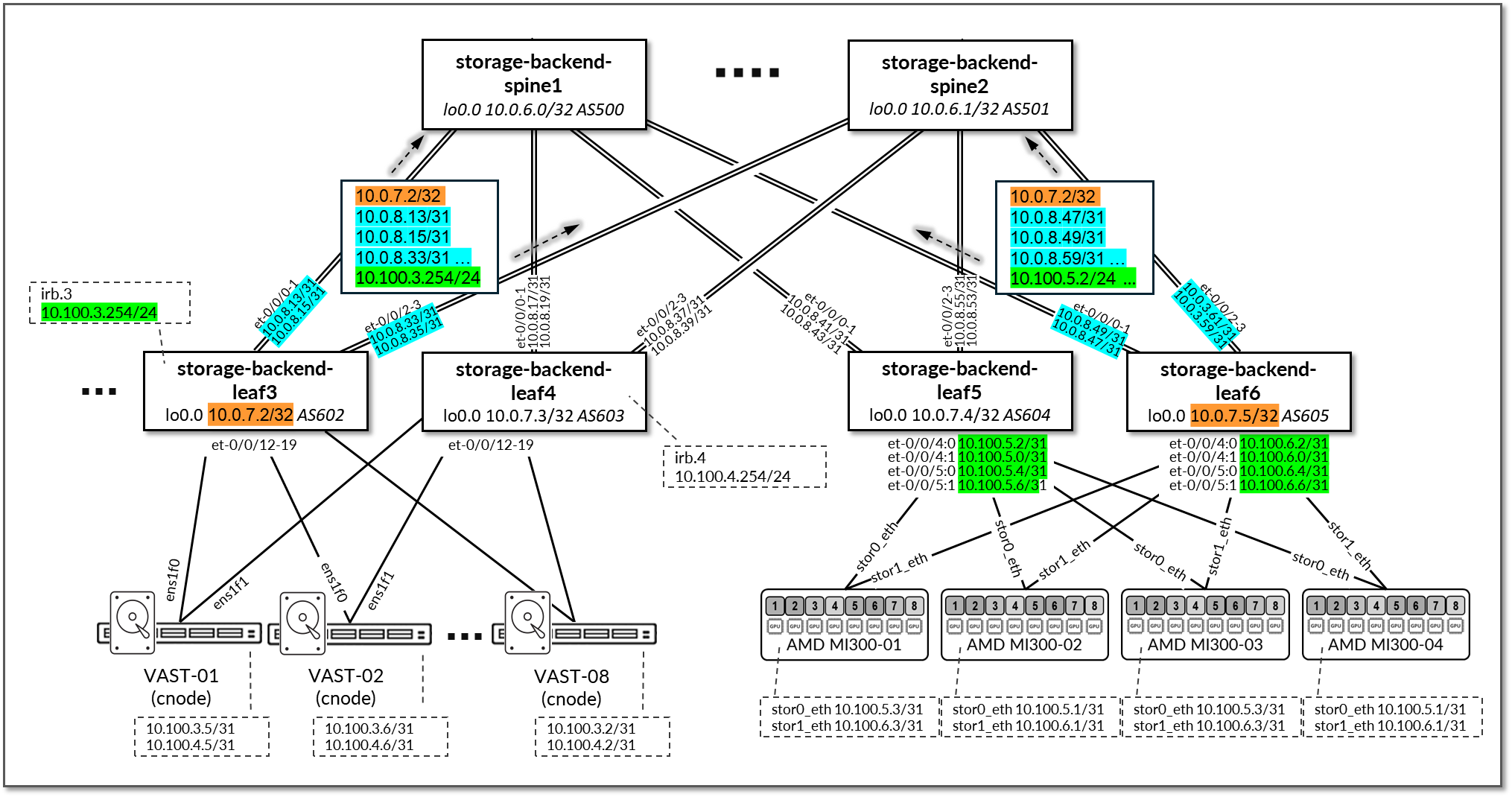 - storage-backend-leaf3, storage-backend-leaf4 nodes irb interface (connection to Vast C-nodes)