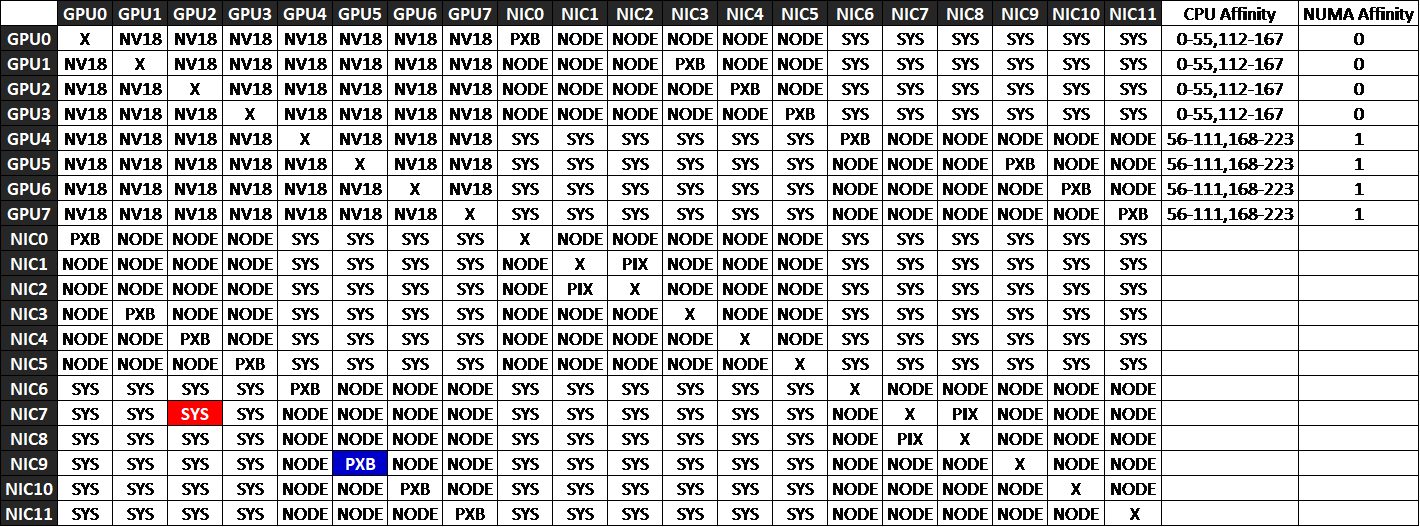 For RDMA traffic, choose PXB or PIX paths for GPU↔NIC pairs to keep communication within the same NUMA domain and PCIe Host Bridge. Avoid SYS or NODE paths whenever possible, as they add unnecessary latency and reduce bandwidth efficiency.