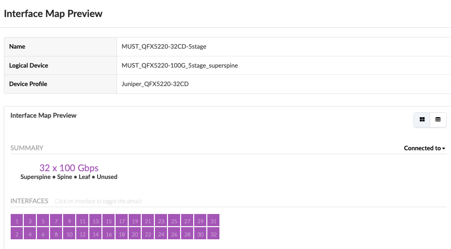 In the following steps, the 5-stage fabric is deployed with the Juniper Apstra. Before provisioning a blueprint, a replica of the topology is created. Before datacenter Blueprint is deployed, a replica of the devices known as Logical devices and Interface Maps should be created. Logical devices are abstractions of physical devices that specify common device form factors such as the amount, speed, and roles of ports without vendor specific information. Logical devices are then mapped to the device profiles using interface maps. The ports mapped on the interface maps match the device profile and the physical device connections.