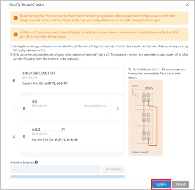 - Connect the VCPs as specified on the Modify Virtual Chassis
