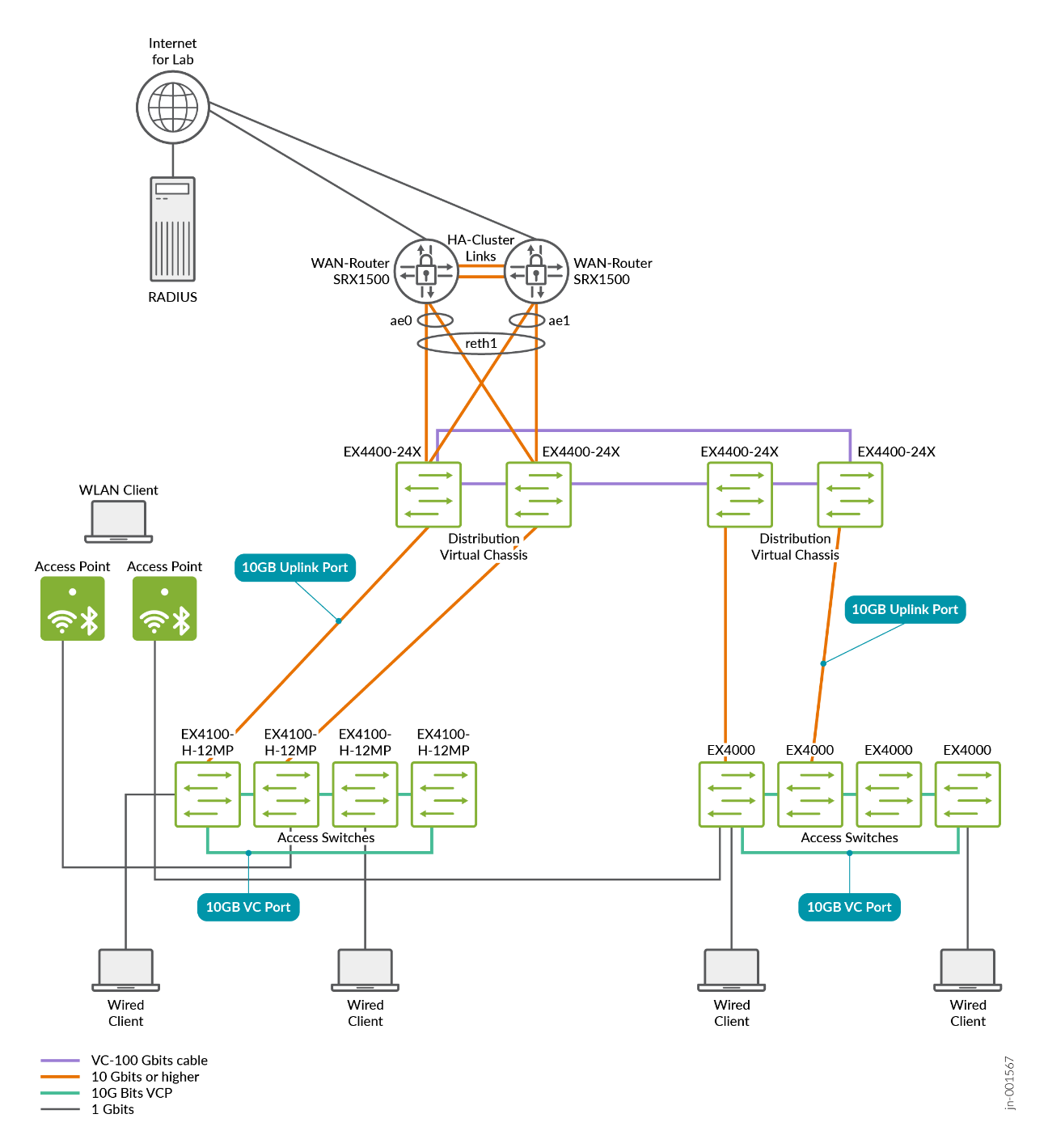 - One four-member Virtual Chassis distribution switch based on Juniper Networks® EX4400-24X Switch.