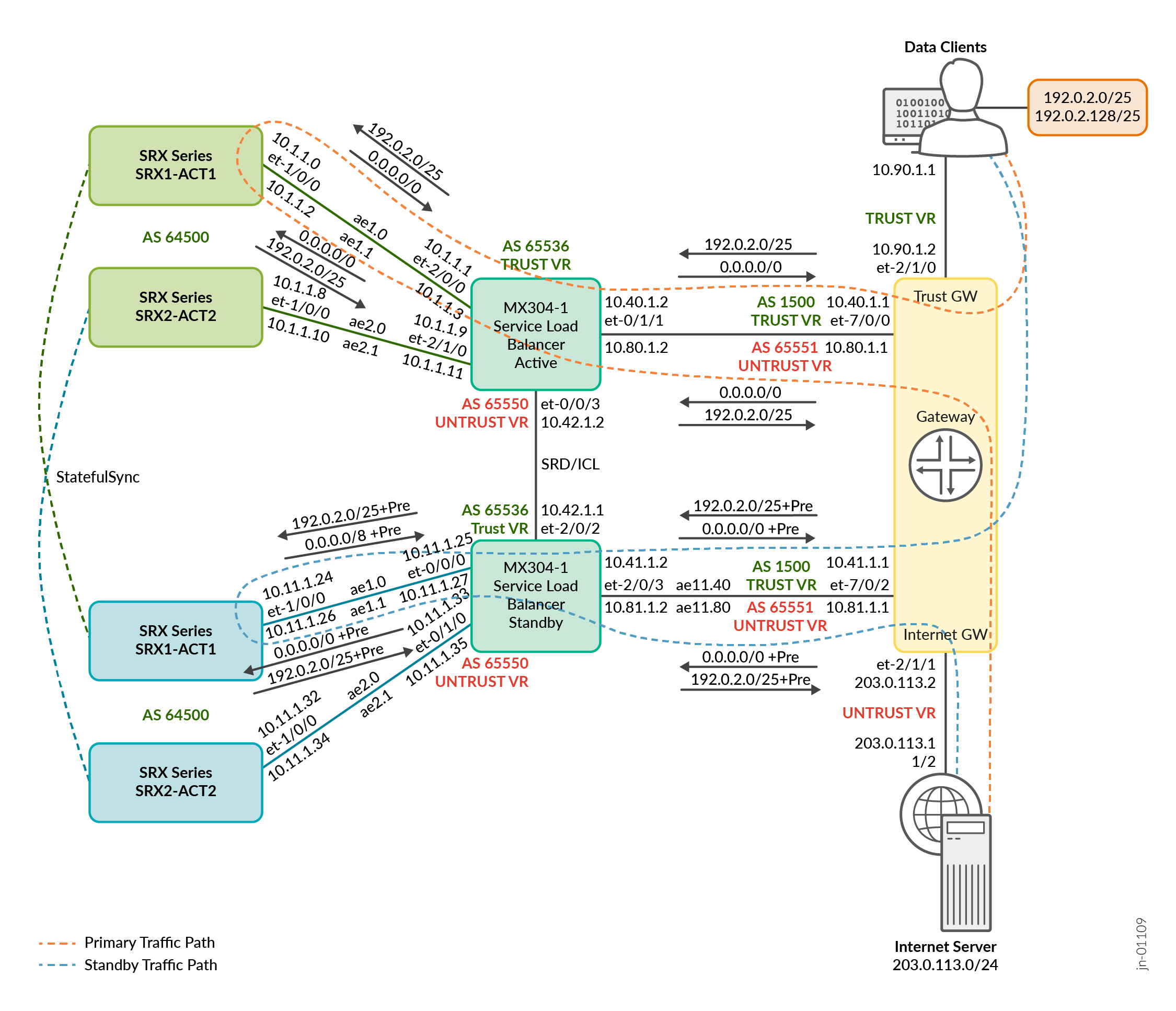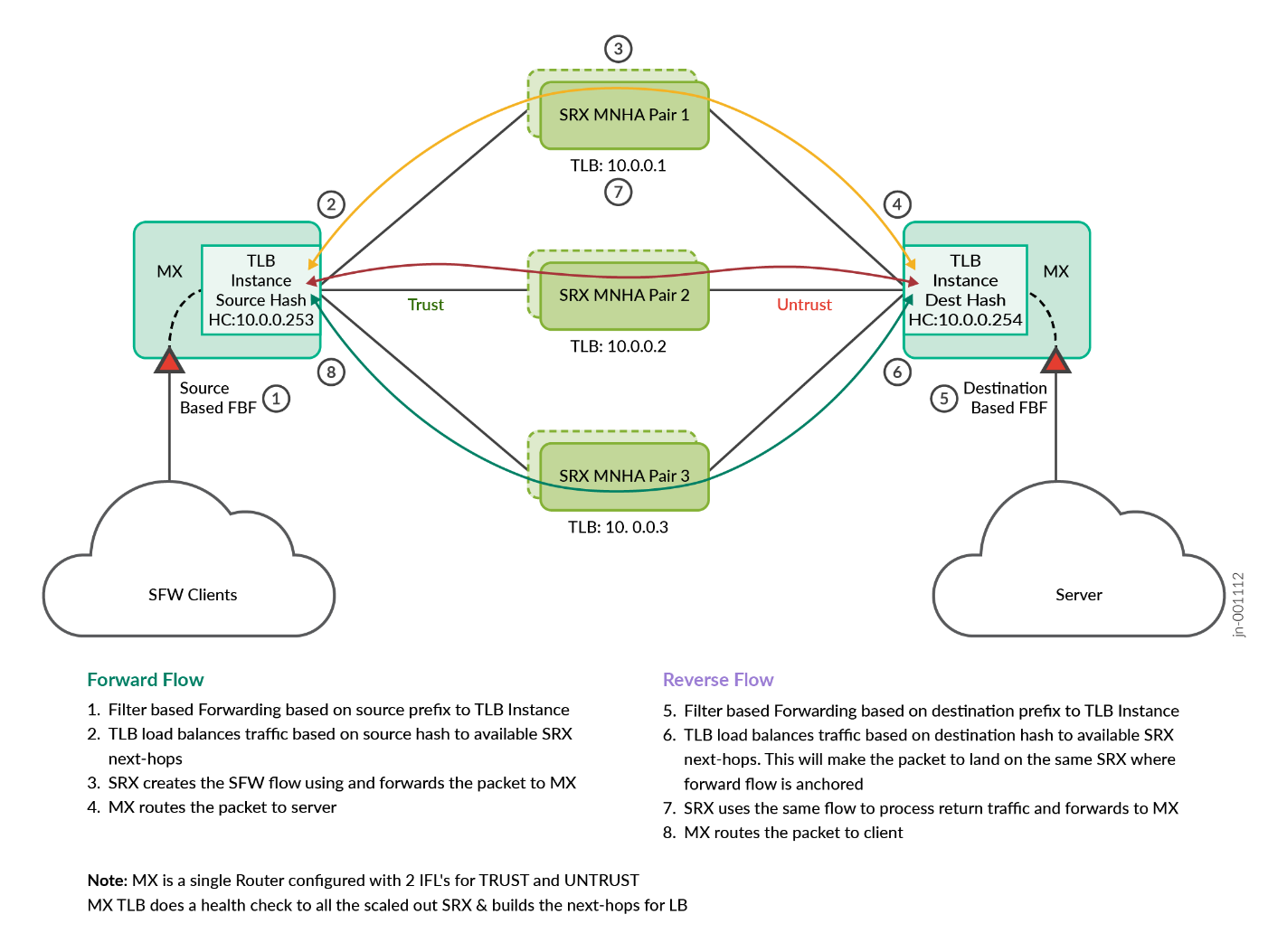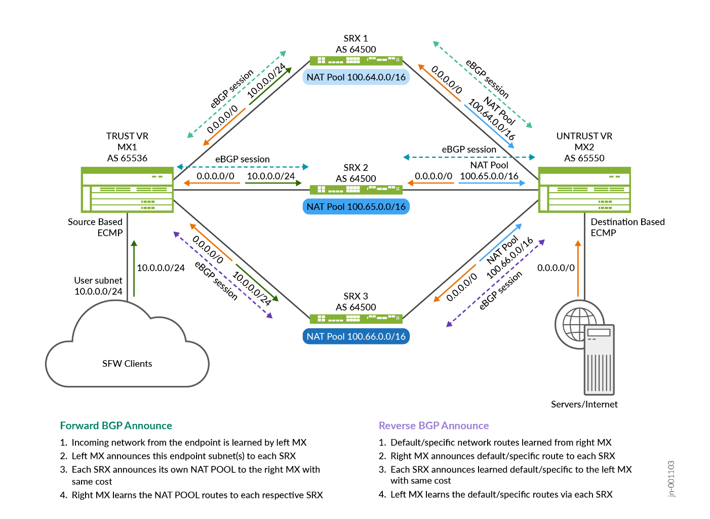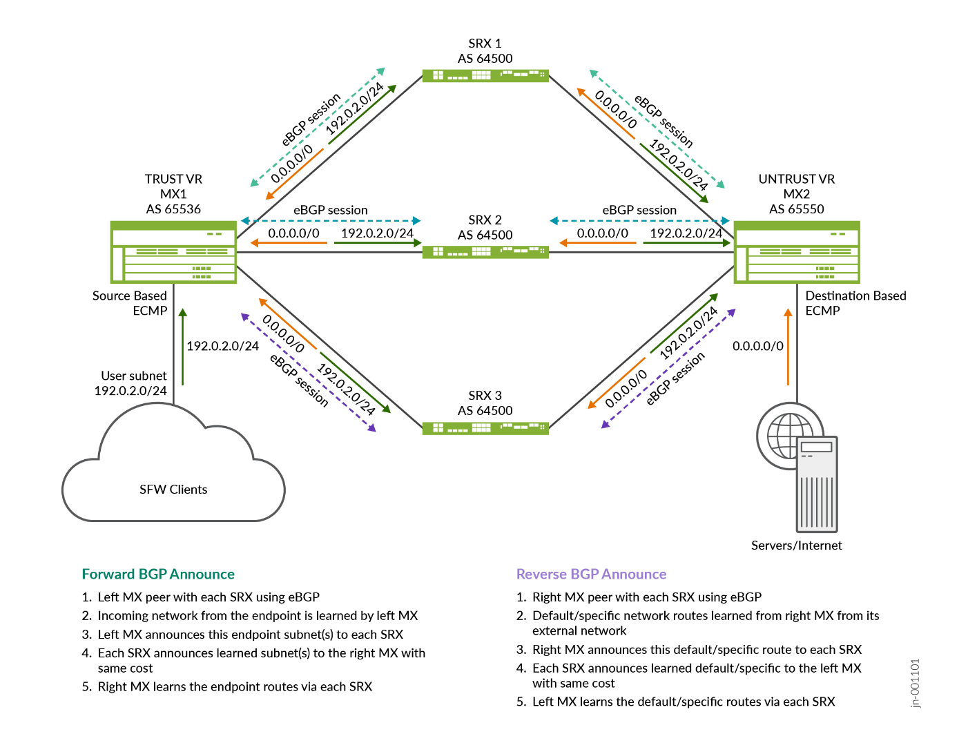 The MX Series Router on the right has used UNTRUST-VR to receive traffic from each SRX Series Firewall and forward it to the next-hop toward the target resources. The routes on each side are announced through BGP to the next hop, making its path available on each MX instance through each SRX Series Firewall (with same cost for load balancing).