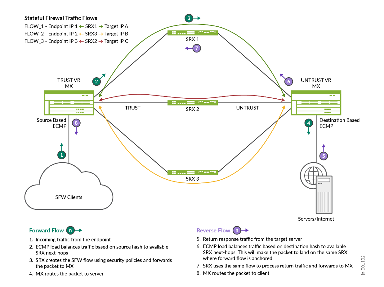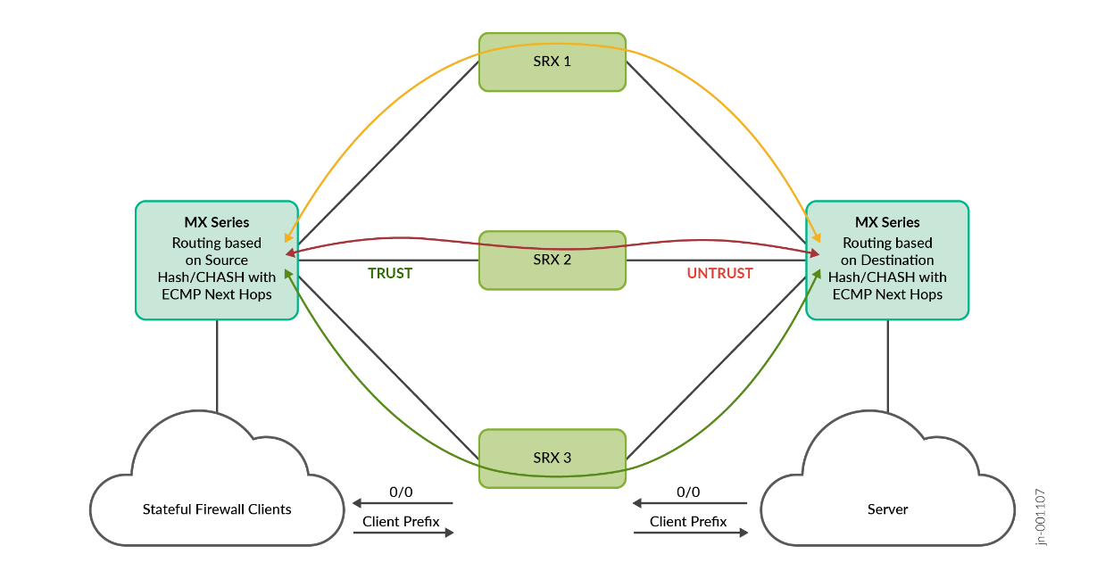 The following diagram shows how traffic flows may be distributed from an MX Series Router to multiple SRX Series Firewalls using ECMP load balancing method. The SRX Series Firewalls are in a symmetric sandwich between the two MX Series Routers in the diagram, whether those MX routers are actually a single physical node configured with two routing instances (more typical) or two physical MX Series Router nodes on each side, the routing principle stays the same as if two routing nodes are used, maintaining the traffic flow distribution that is consistent in both directions.
