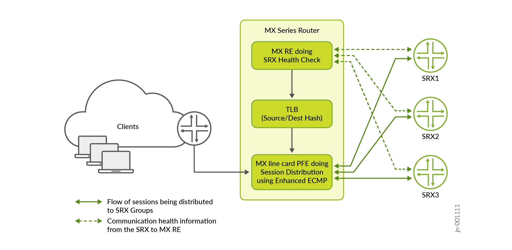 - Load balancing of sessions across multiple SRX Series Firewalls in standalone or high availability