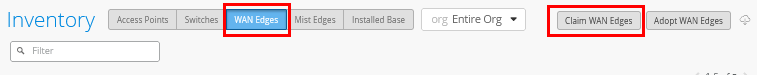 Mist Claim Code Entry. You can use the Mist mobile application to scan the QR code directly or use it on the Juniper Mist portal. Go to Organization -> Inventory, select WAN Edges and click on Claim WAN Edges as shown in the figure below: