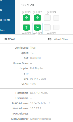 Next, hover the mouse over some of the device ports to review what is configured and detected. In this example, you see at the bottom that the lab switch is detected as a client attached to the port: