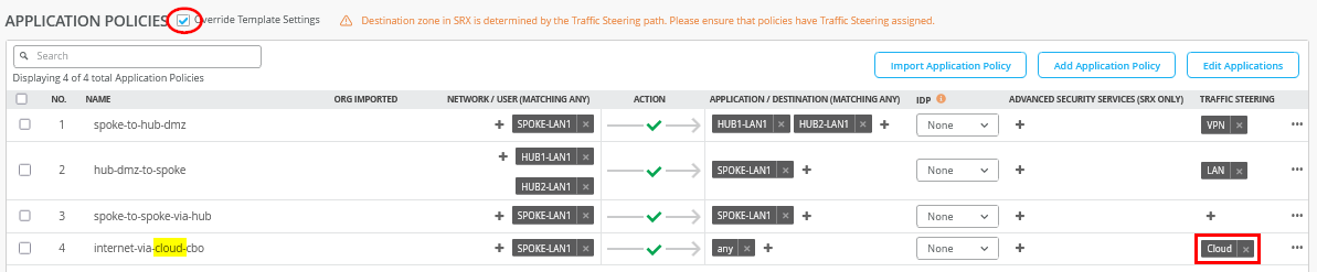 Next, we applied Rule 4 from the application policies to steer all traffic not destined for the VPN toward the two hubs for centralized Internet breakout, using “any” as the traffic destination:
