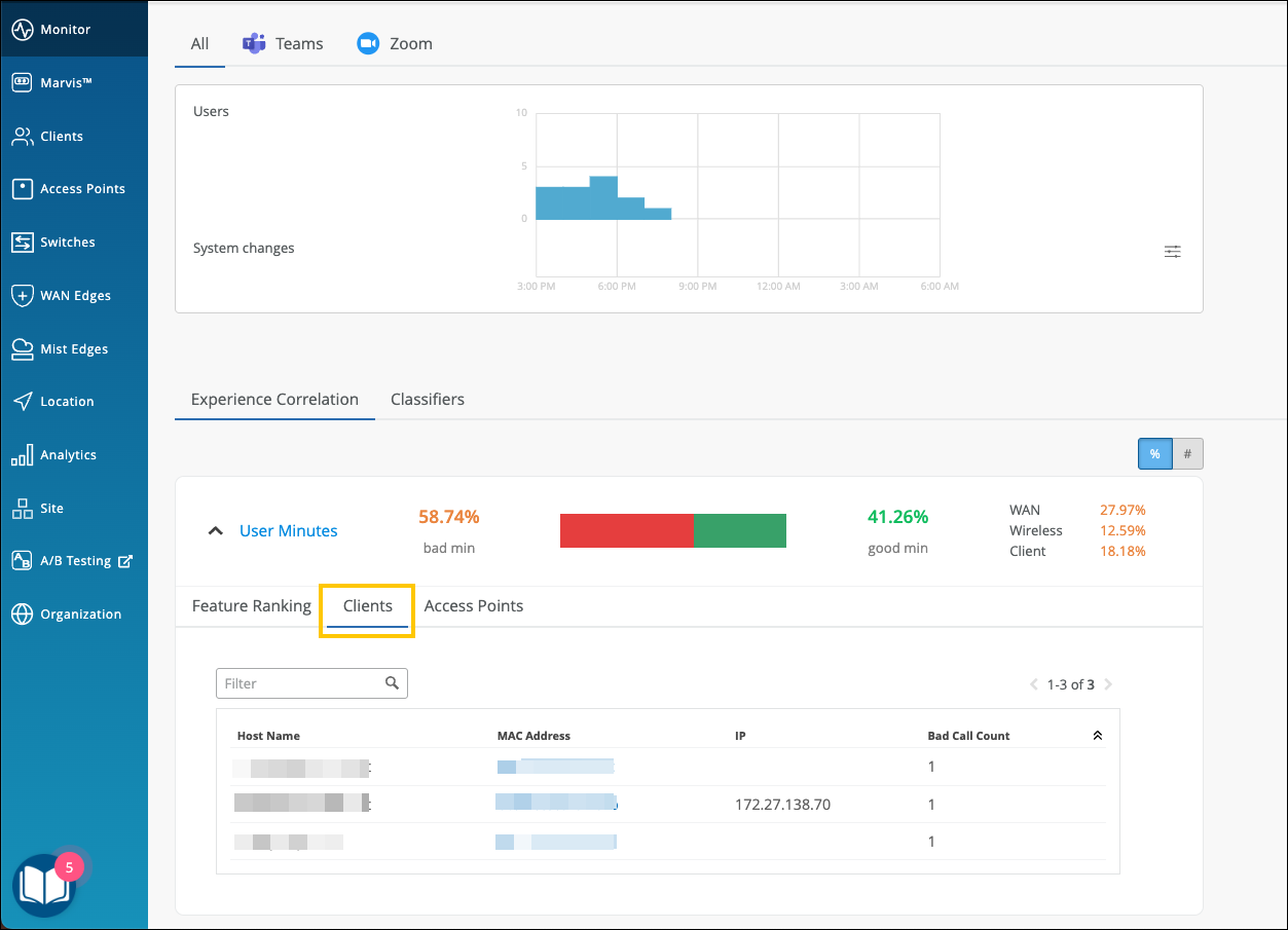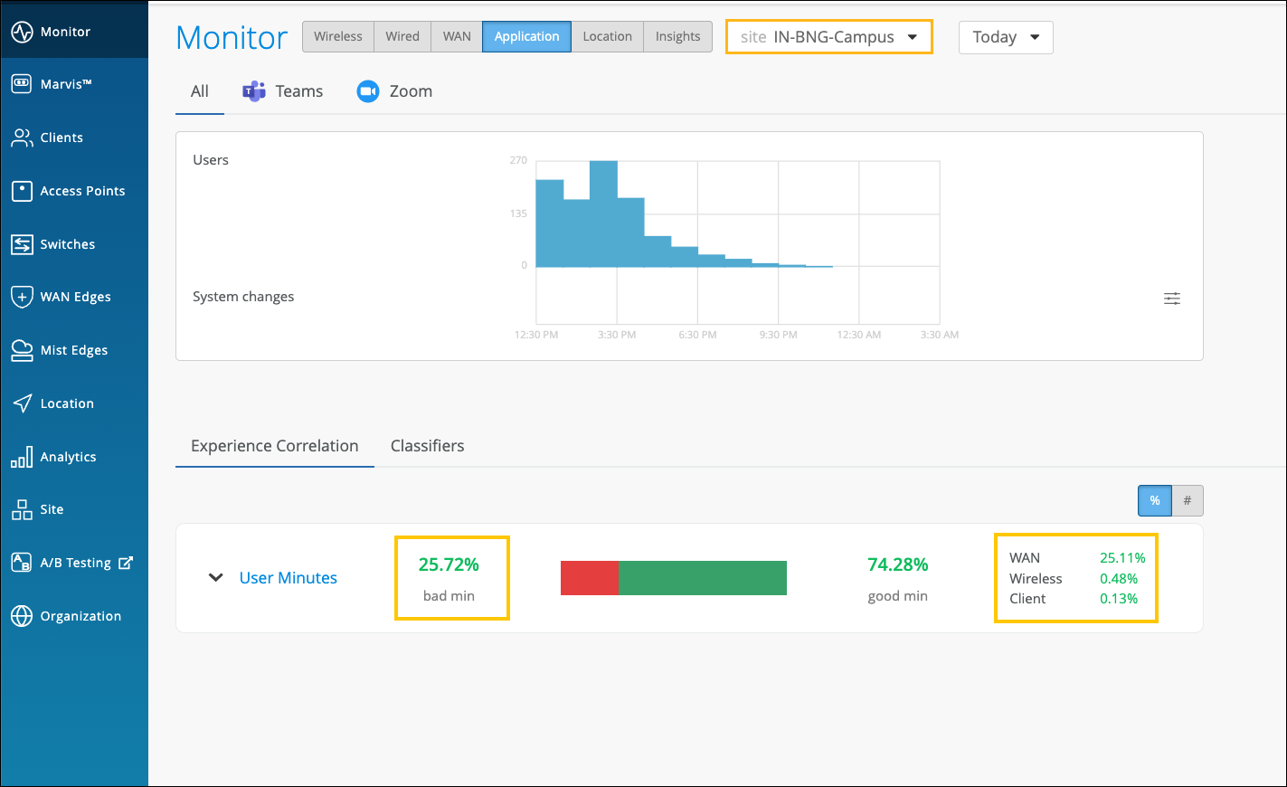 As Juniper Mist provides the correlation based on the latency, loss, and jitter data it fetches from the third-party applications (Zoom and Teams), fewer bad user minutes also serve as a third-party validation of your network.