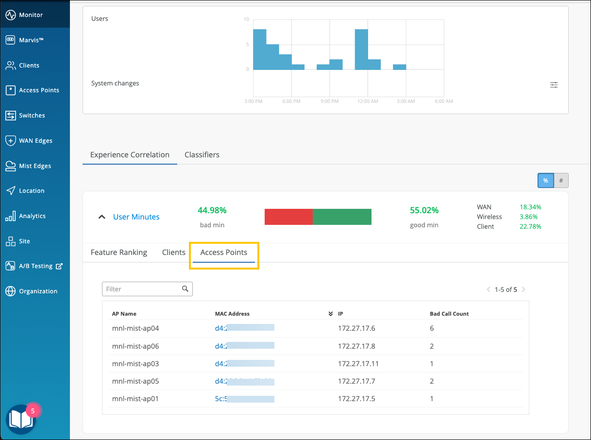 Use the feature ranking graph to identify which features contributed the most to an issue, Also view the insights for the impacted clients and the APs that they're connected to. If clients experience degraded Zoom or Teams call quality, use the experience correlation at the site level to easily identify which APs are involved.