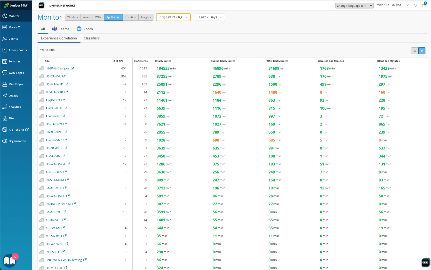 Experience correlation provides visibility into the performance of Teams and Zoom applications at a site or an organization level. With detailed insights into the factors impacting the application quality, the correlation data helps network administrators to quickly identify issues causing bad user experiences across a site or an entire organization.