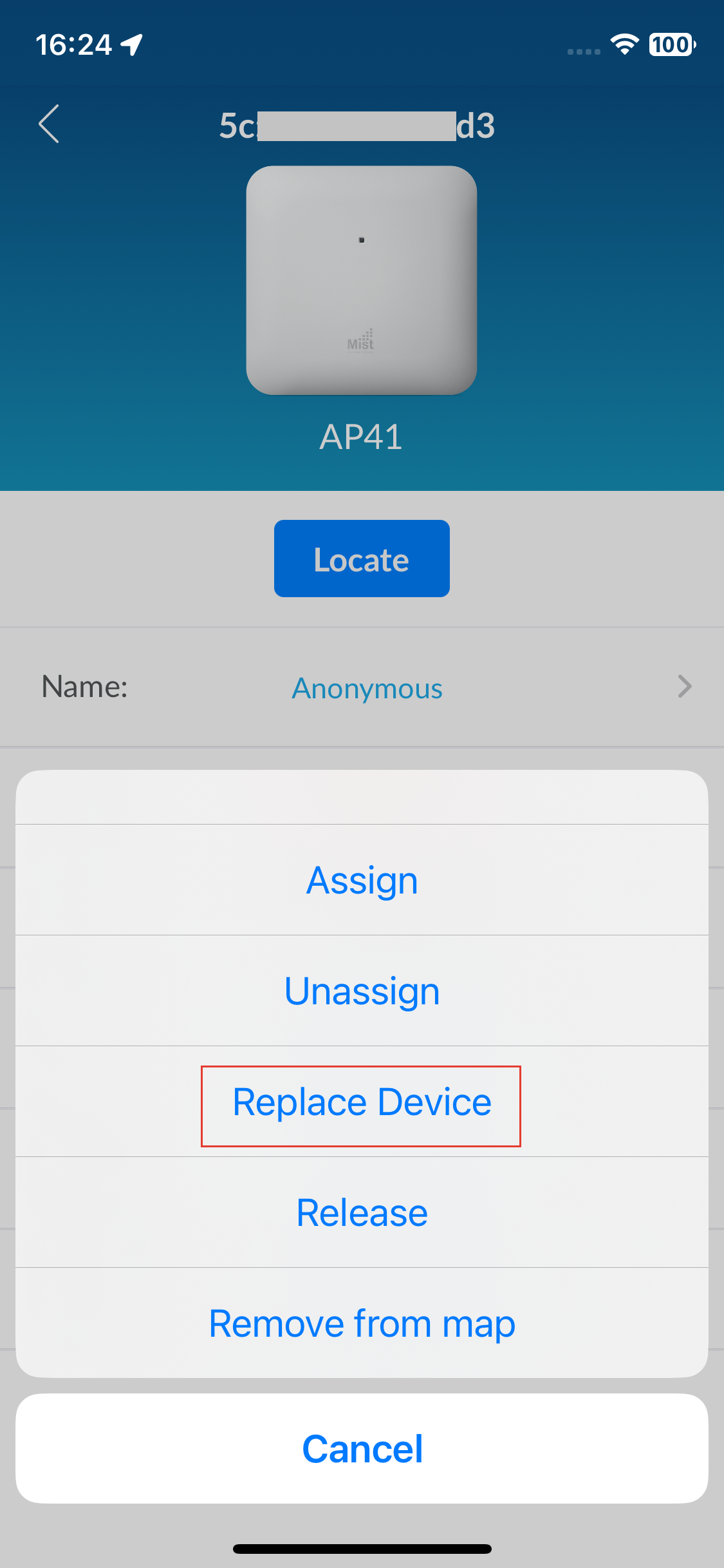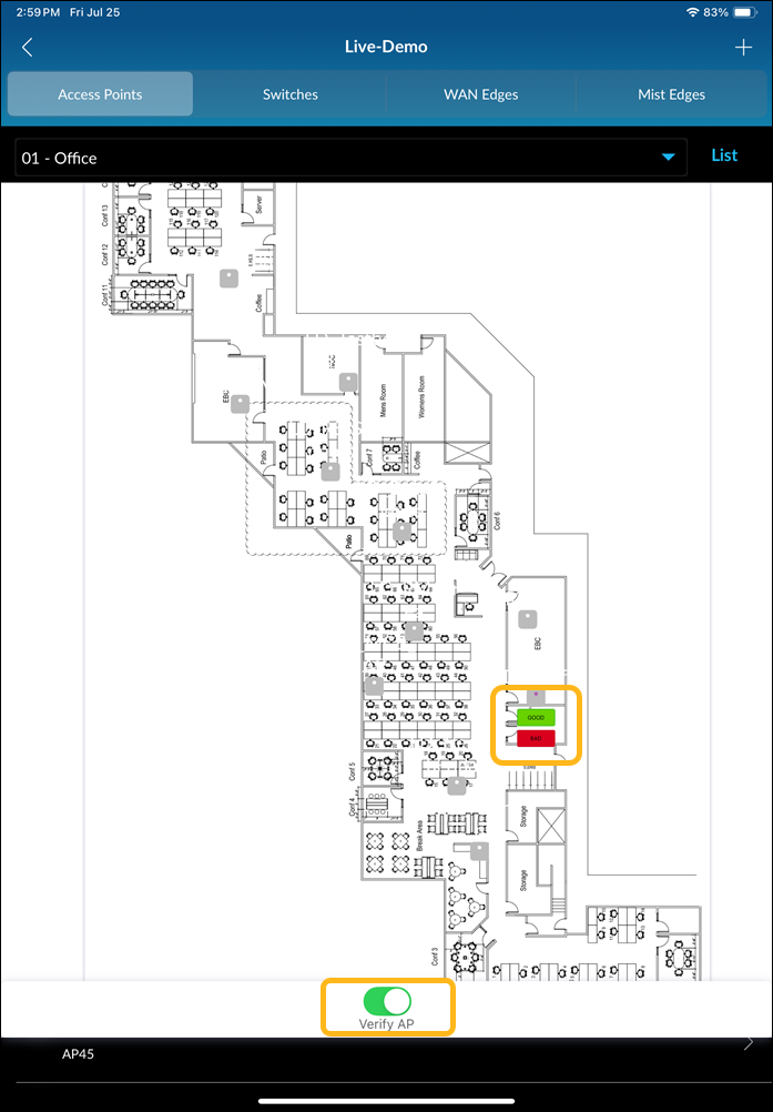 - Navigate to the Device Inventory or Site page on the Mist AI mobile app.