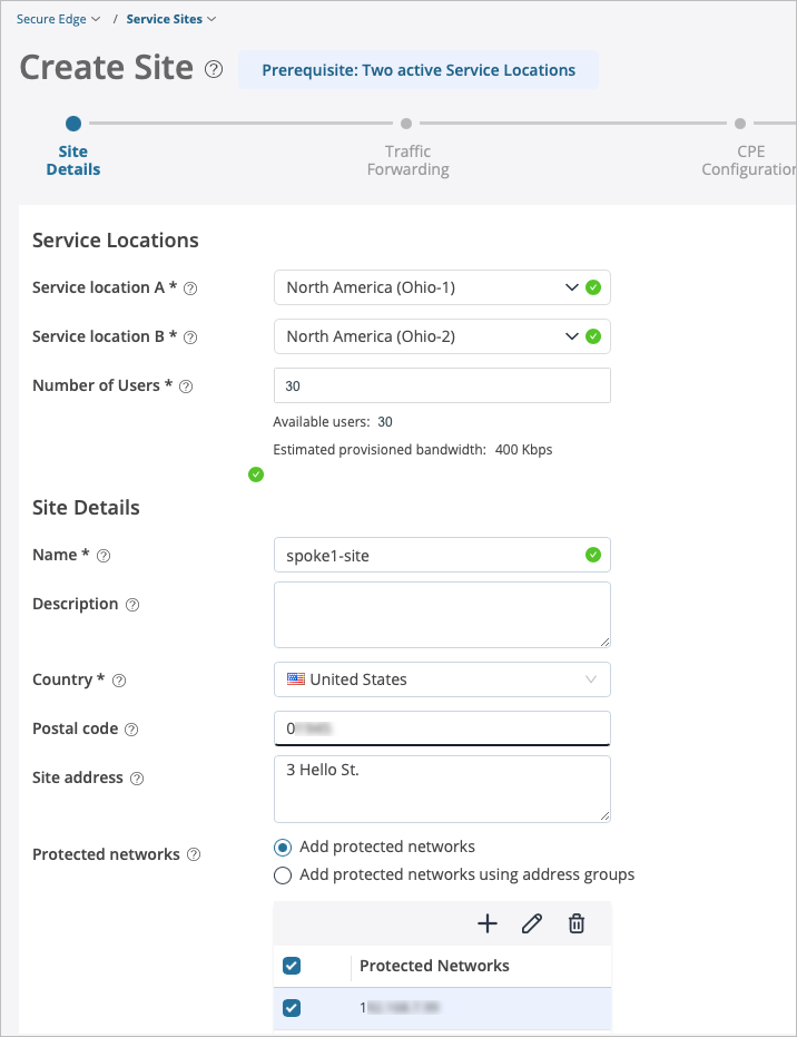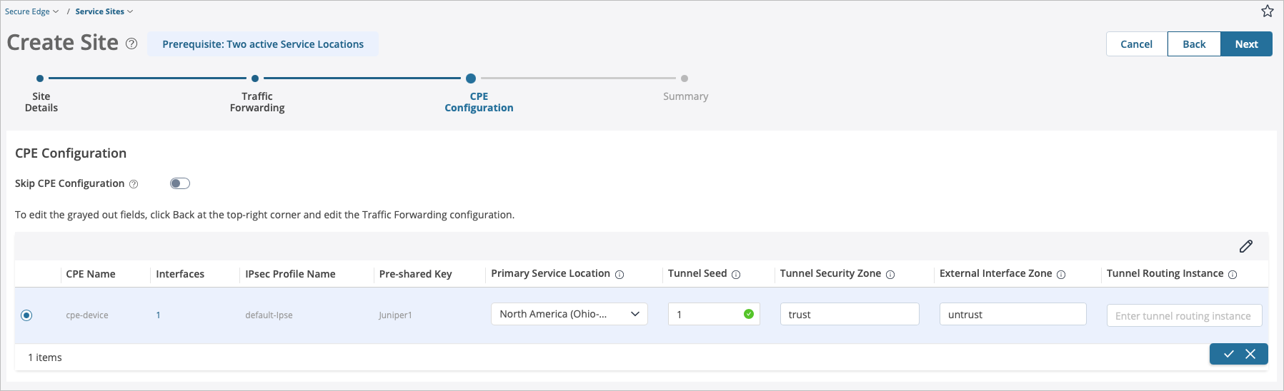 At this point, you need to create a site in Juniper Security Director Cloud. A site represents a location that hosts a WAN edge device. The traffic from the WAN edge device is forwarded to the Secure Edge instance through a secure tunnel, and then inspected and enforced by the Secure Edge cloud services.