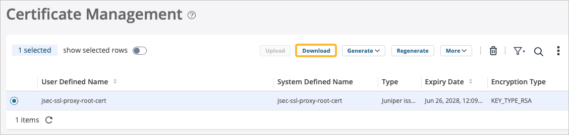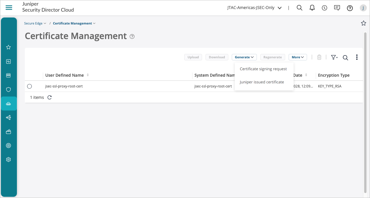 | 3 | Generate Device Certificates in Juniper Security Director Cloud | Generate digital certificates for Juniper Secure Edge to establish secure communications between Secure Edge and user endpoints. |