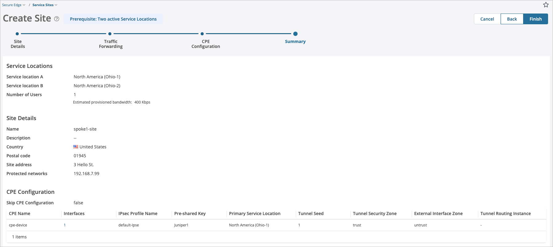 In the preceding tasks, you completed several actions to set up IPsec tunnels in Juniper Secure Edge and have deployed the Secure Edge policy in Juniper Security Director Cloud. The final step in Security Director Cloud is to collect configuration data for each site. You'll need these details to complete the secure edge connector configuration (Create Secure Edge Connectors in the Juniper Mist Portal) in the Juniper Mist™ cloud to set up an IPsec tunnel. In this step, you'll note down the details of the sites you created.