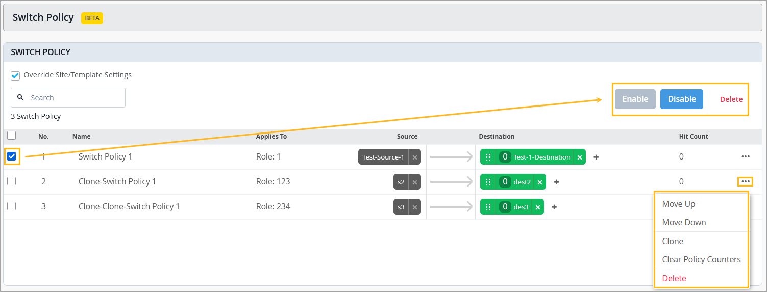 Use the instructions below to clear switch policy hit count, clone, delete, reorder, disable, and enable switch policies.