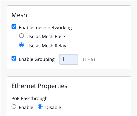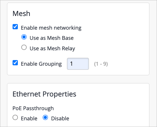 (Optional, to control failover with multiple mesh links in a site) Click Enable Grouping and enter a group number (1 through 9) to control which relay APs can failover to a given base AP.