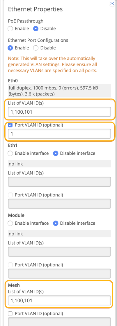 Here's an example that shows the Eth0 settings on the base AP with VLAN IDs 1, 100, and 101. VLAN 1 is the management VLAN of the AP. You must specify this value in the Port VLAN ID field or else the AP will disconnect from the cloud. VLAN 100 and VLAN 101 are for tagged SSIDs, which are broadcasting on the relay AP but not on the base AP.