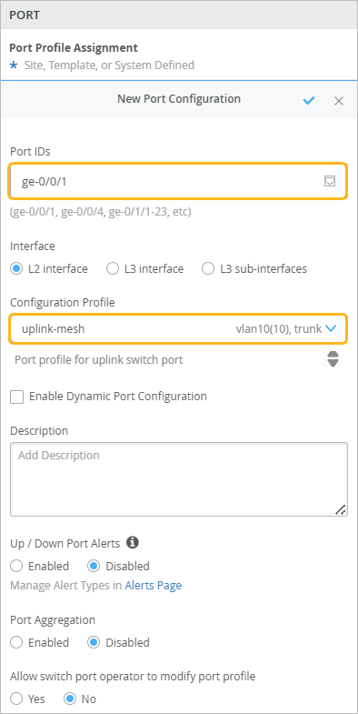 Assign the port profile to the ge-0/0/1 port on the uplink switch. Navigate to the Device section, and click Add Port Configuration. Select the Port ID (ge-0/0/1) and the configuration profile that you created in the previous step.