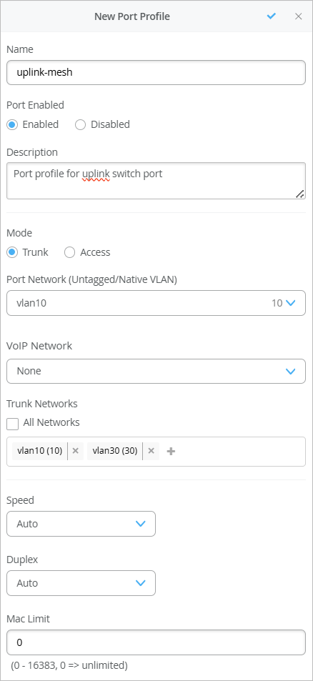 Click the check mark at the upper right of the Port Profile window to save the configuration.