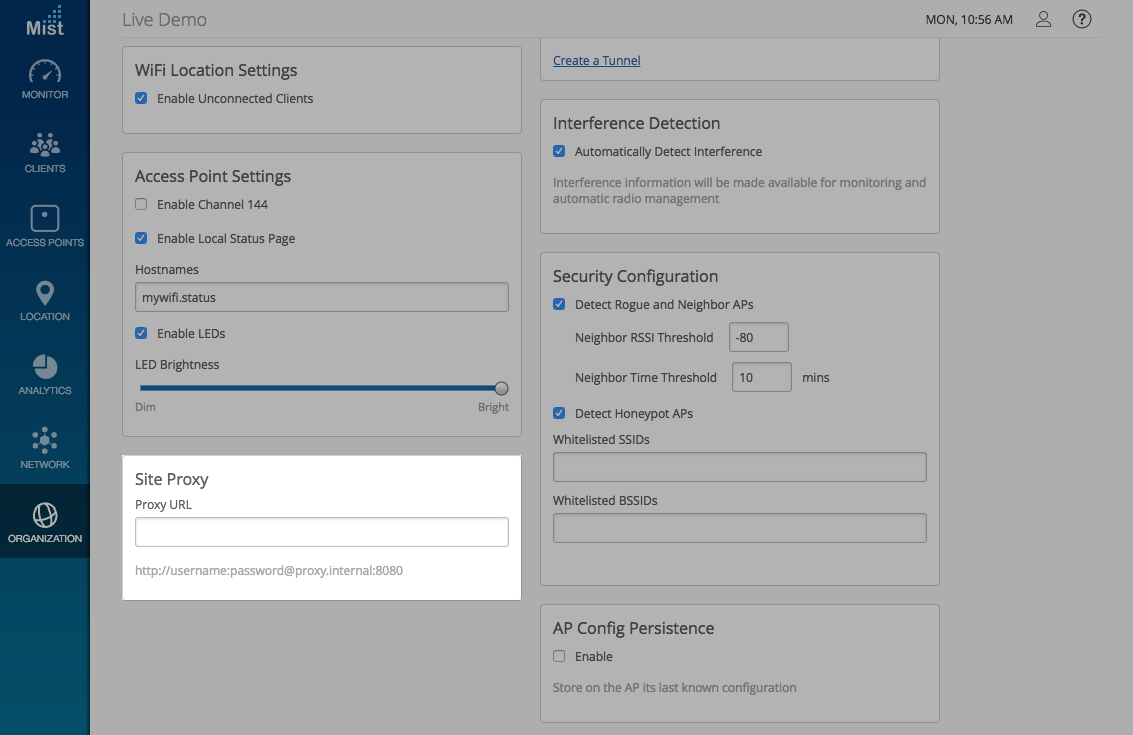 Proxy servers are used as a middleman between your local network and the Internet. The use of a proxy can provide extra security as well as a more controlled network environment. Now we allow integrating your proxy server with our Mist cloud in a seamless fashion. By providing your proxy server information in Site Settings, our Mist APs will fetch this config, and once placed in the correct environment, connect directly to the proxy first before reaching out to the Mist Cloud. Here’s how to set up your proxy configuration: