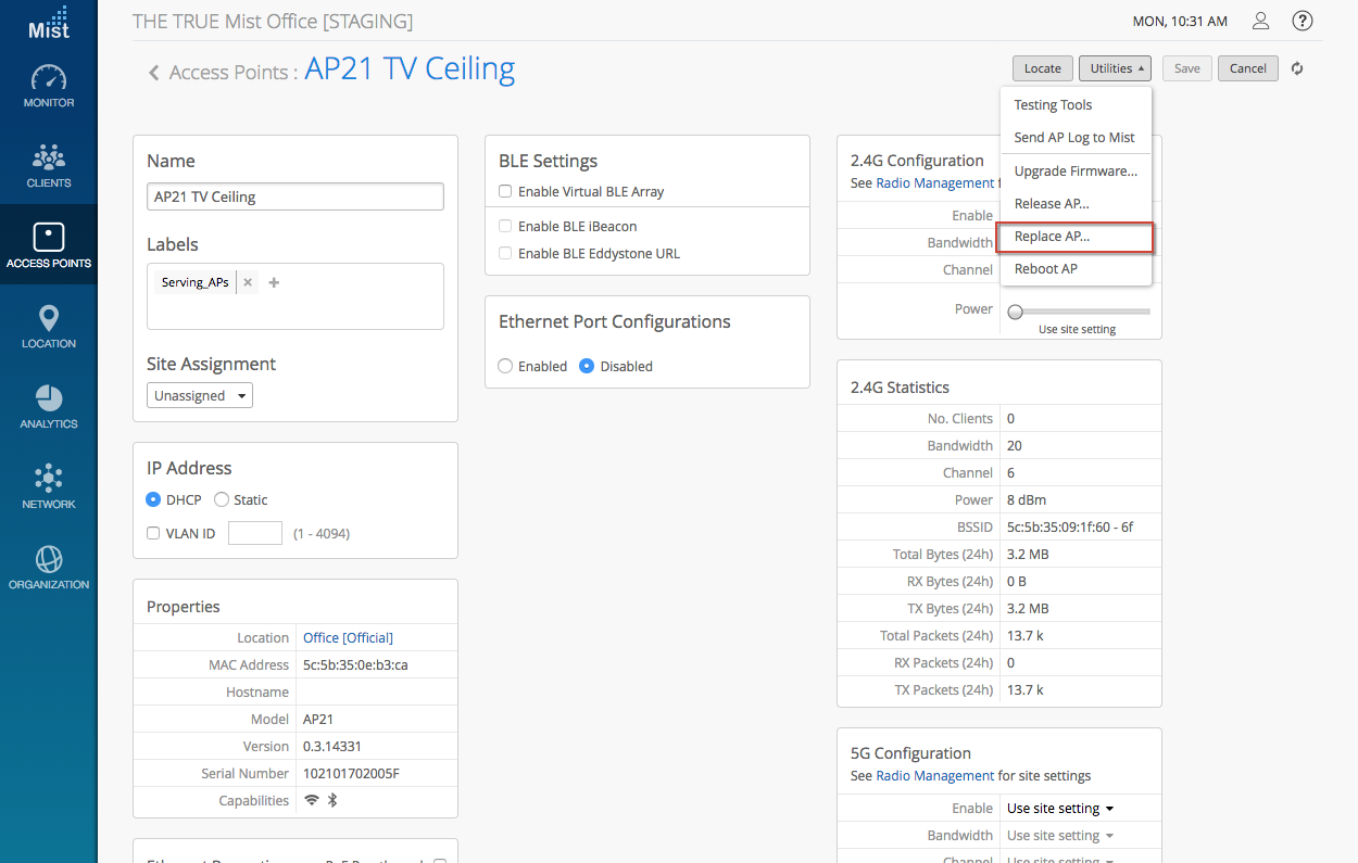 In the Access Points window, navigate to the Utilities dropdown and select Replace AP. This will allow you to select an unassigned AP from your site and copy the current AP configuration onto it.