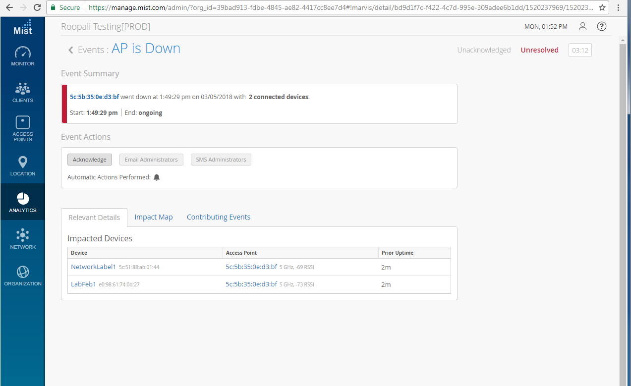 This week we fixed an error where impacted devices were getting counted twice per client whenever an AP down even occurred. With this bug fix, Impacted Devices under the Relevant Details tab of Analytics will show an accurate list of impacted clients.