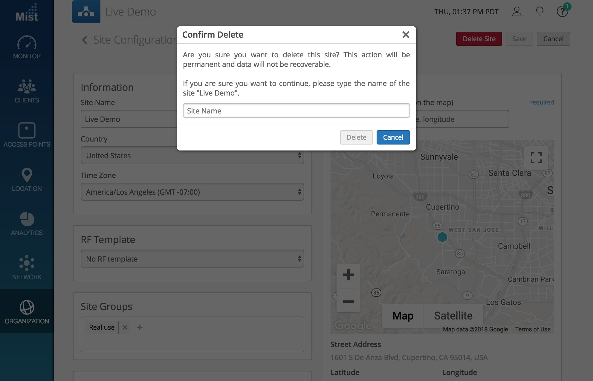 Mist is always working on making your network the most secure and reliable it can be, and this week we are introducing a safety mechanism to prevent accidental deletion of your site. Users trying to delete a site will be prompted with a message and required to type out the full name of the site as a confirmation for deleting. The site deletion button is in the same location (Organization > Site Configuration), we’ve just added an extra step in the process.