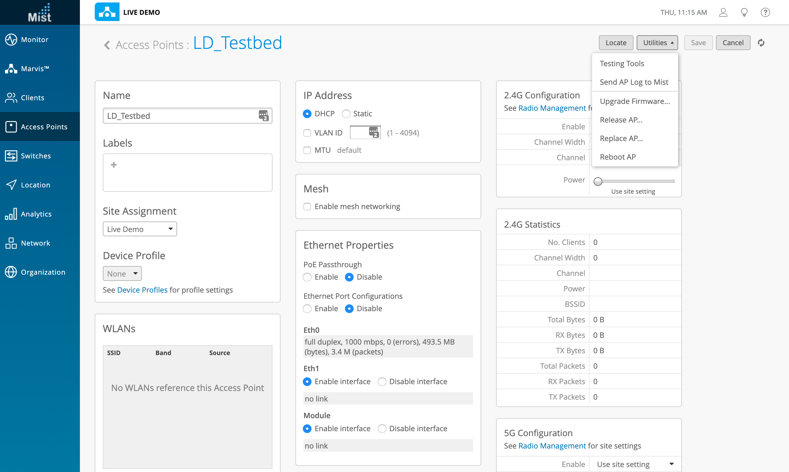 The Replace AP function allows users to copy the entire configuration of an old AP (WLANs, settings, physical locations) onto a new AP. In the Access Points window, navigate to the Utilities dropdown and select Replace AP. This will allow you to select an unassigned AP from your site and copy the current AP configuration onto it.