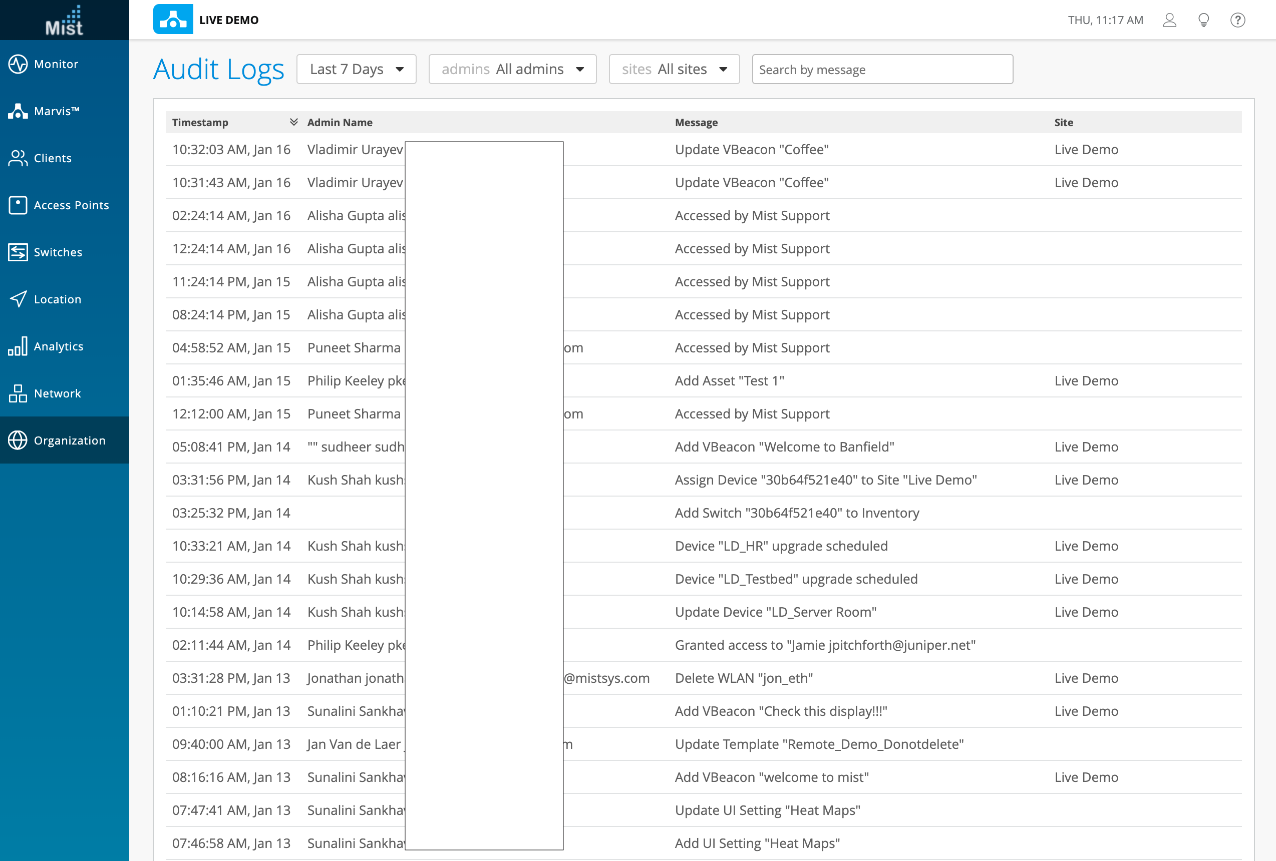 Audit logs record all administrative activities in an organization, such as creation or deletion of WLANs, updating an AP, or adding Policies. These logs allow you to have more traceability to configuration changes on your network. You may also filter your search down by selecting all of the admins and sites to include in your search.