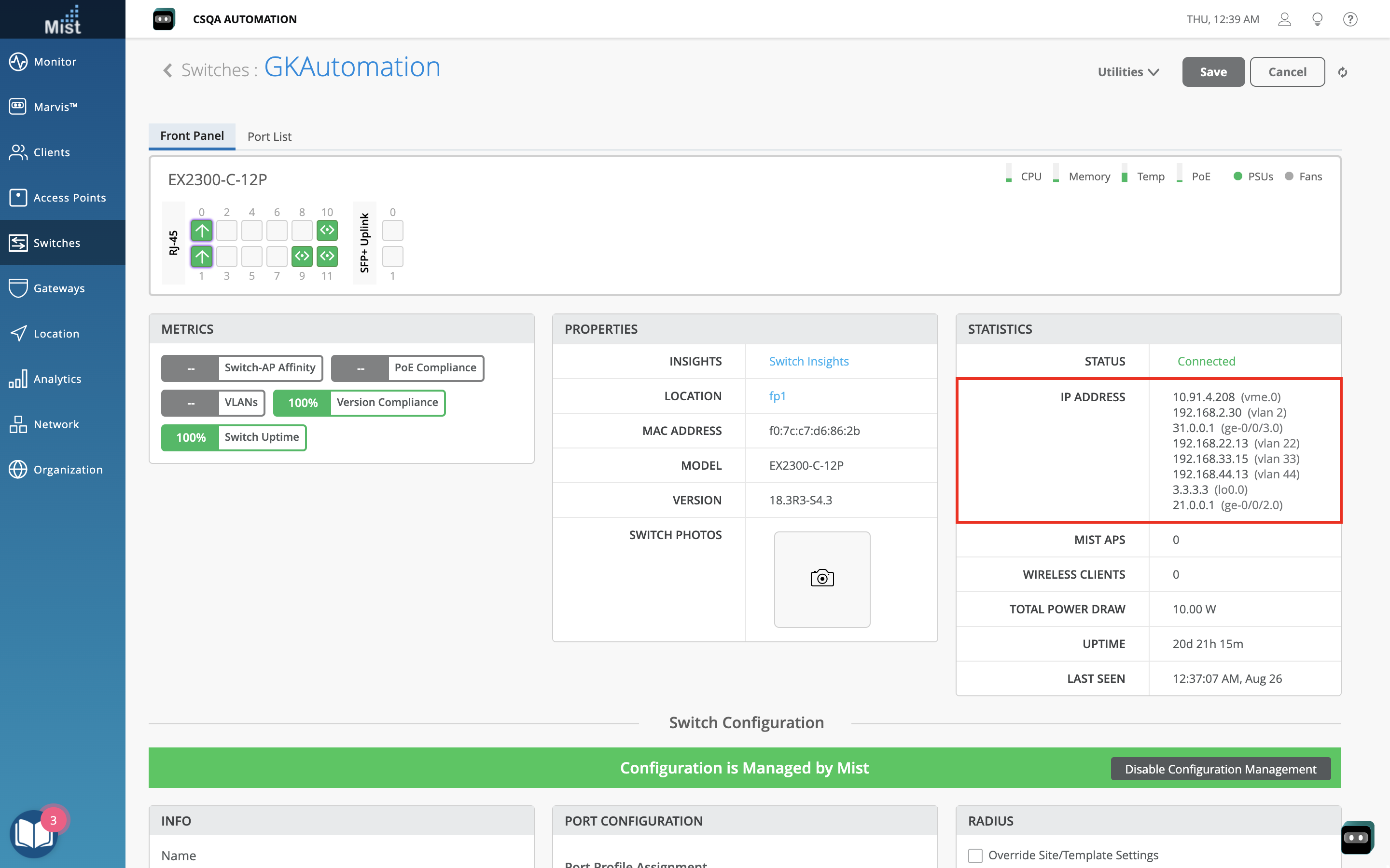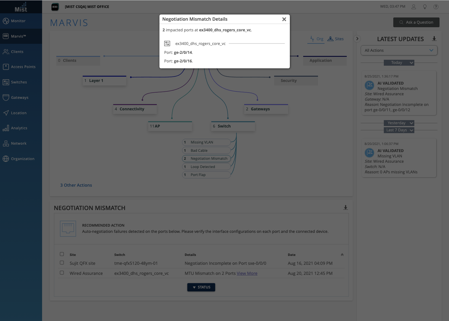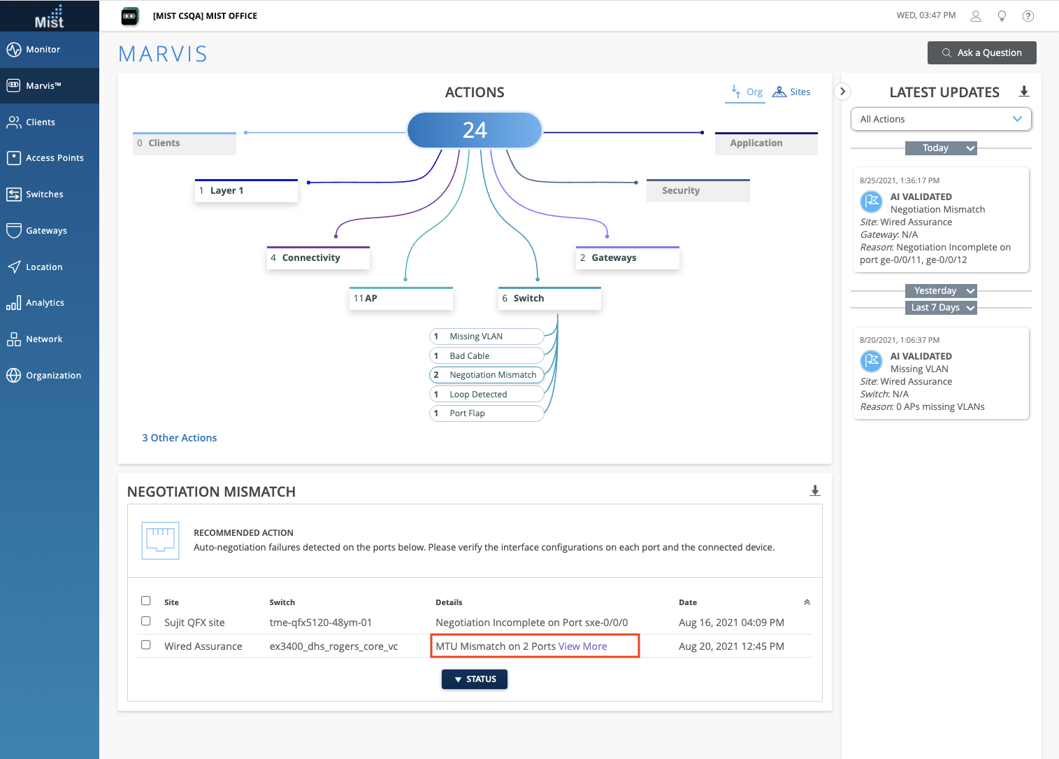 We are cleaning up how we display Actions that involve multiple ports of the same switch/gateway i.e. a single switch experiencing MTU Mismatch on 2 different ports. Previously, we displayed the list of all problem ports directly in the Details column. Starting this week, if a switch or gateway has more than one port experiencing an issue, a View More link will be included in the Details column, which will open a pop up modal displaying the full list of ports involved. This is similar to how we display multiple Missing VLAN or AP Offline issues.