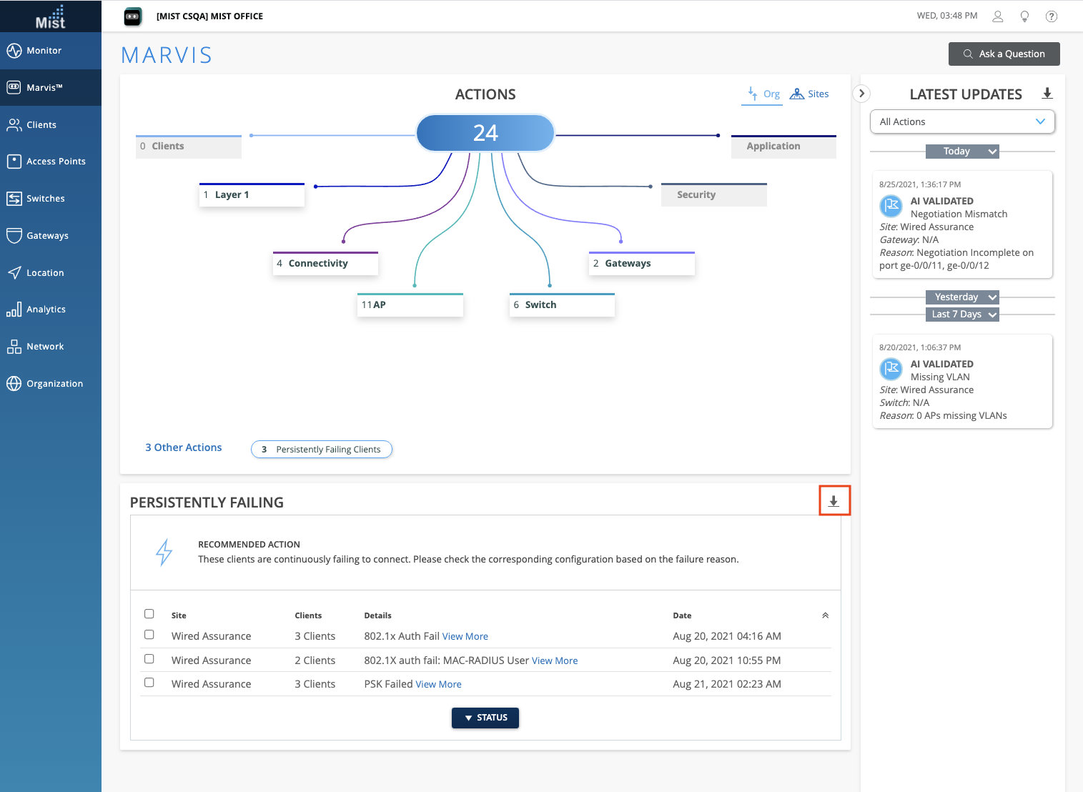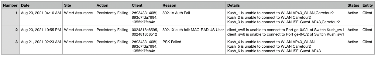 Earlier we introduced the Persistently Failing Marvis Actions which captures cases where clients (wired/wireless) are continuously failing to connect due to a client specific issue (the scope of failure is not related to AP, WLAN, or network servers). Now, you can download the full list of your Persistently Failing clients in an organized .CSV file format. All the details visible on the Actions Dashboard UI are included in this file download, including the reason for failure, WLAN, and Switch/port details. Find the download button at the top of your Actions Details box.