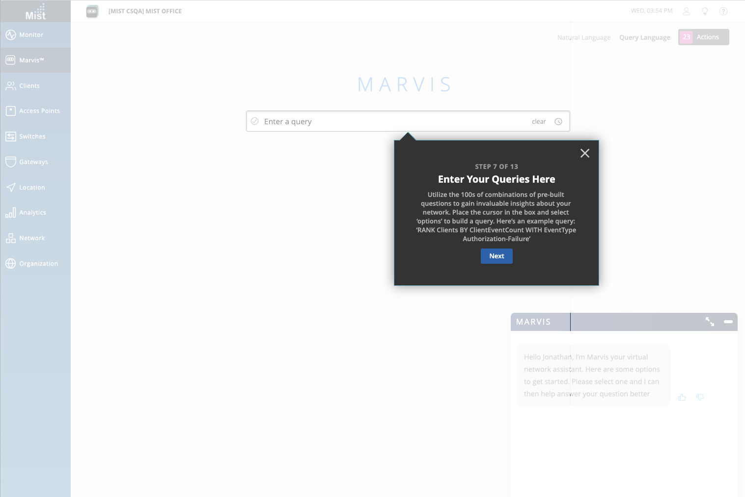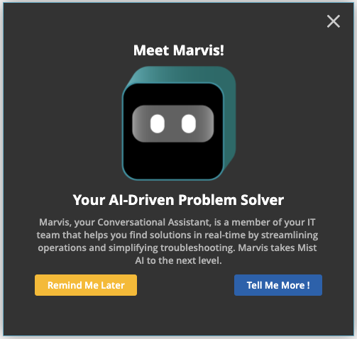 Today, Marvis supports three different main functions: Conversational Assistant, Action Dashboard, and the Natural, Query language interfaces. To ensure you are aware and are focusing on each of these areas, or to give new users an introduction to Marvis, we have included a Meet Marvis guide that will briefly walk you through the different Marvis features directly on our dashboard. Go through the step-by-step guide to familiarize yourself with Marvis, or feel free to exit out of the pop up and it will not show up again.