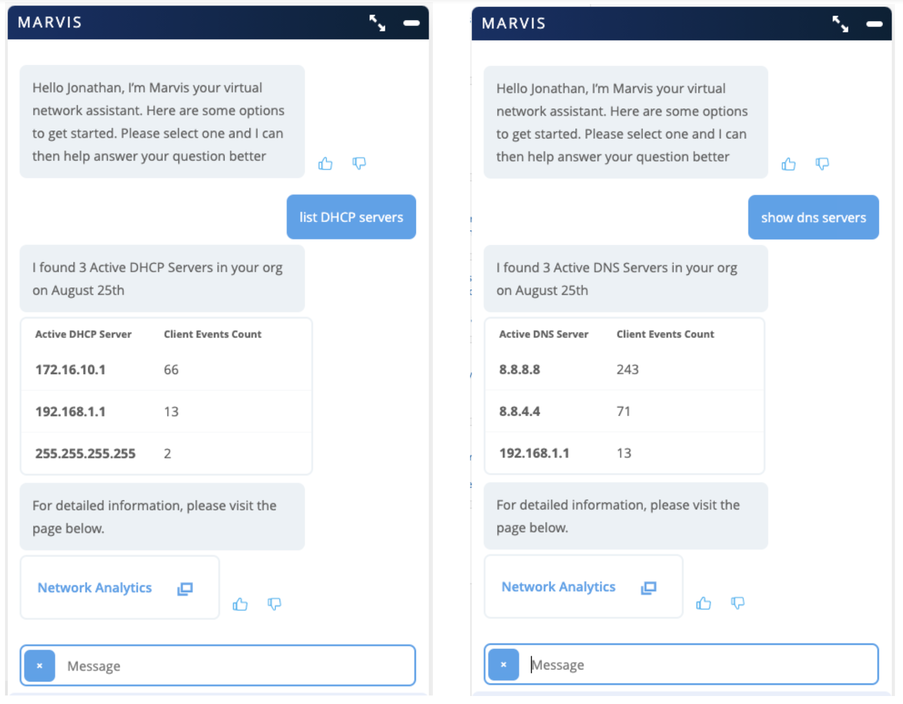 We are constantly making improvements and adding more support to our Marvis Conversational Assistant. Starting this week, Marvis can now show you your DNS, DHCP, and Radius servers. Marvis will return a list of all active servers on your organization as well as provide a client event count on each one. A link to your Network Analytics page will redirect you to your Analytics dashboard where you can create your customized report & view more details.
