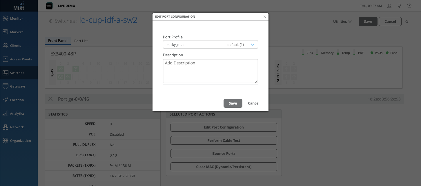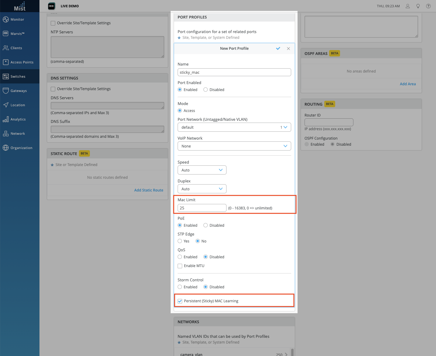 To configure Persistent MAC learning, navigate to your Switch Details page and configure a Mac Limit in your port profile. This is the maximum number of MAC addresses that will be learned. Make sure to enable Persistent (Sticky) MAC Learning at the bottom.