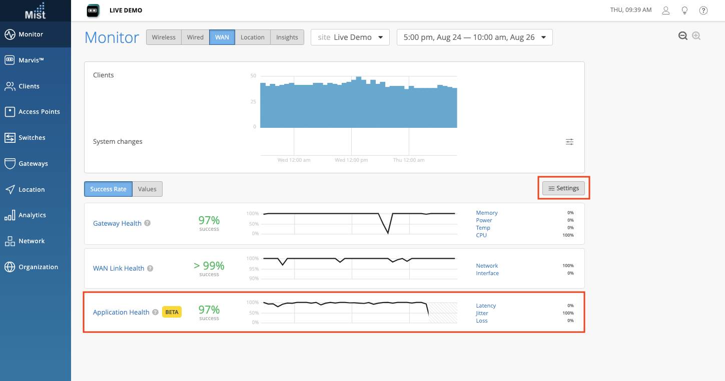 We are excited to announce a Beta release of the Application Health SLE! The goal of this WAN SLE is to measure the real-time network user experiences at the application level. For example, a weak network connection may give good user experiences for FTP or SMTP-based applications, but bad user experiences for VoIP applications. The Application Health SLE will help you identify which applications are giving you trouble.