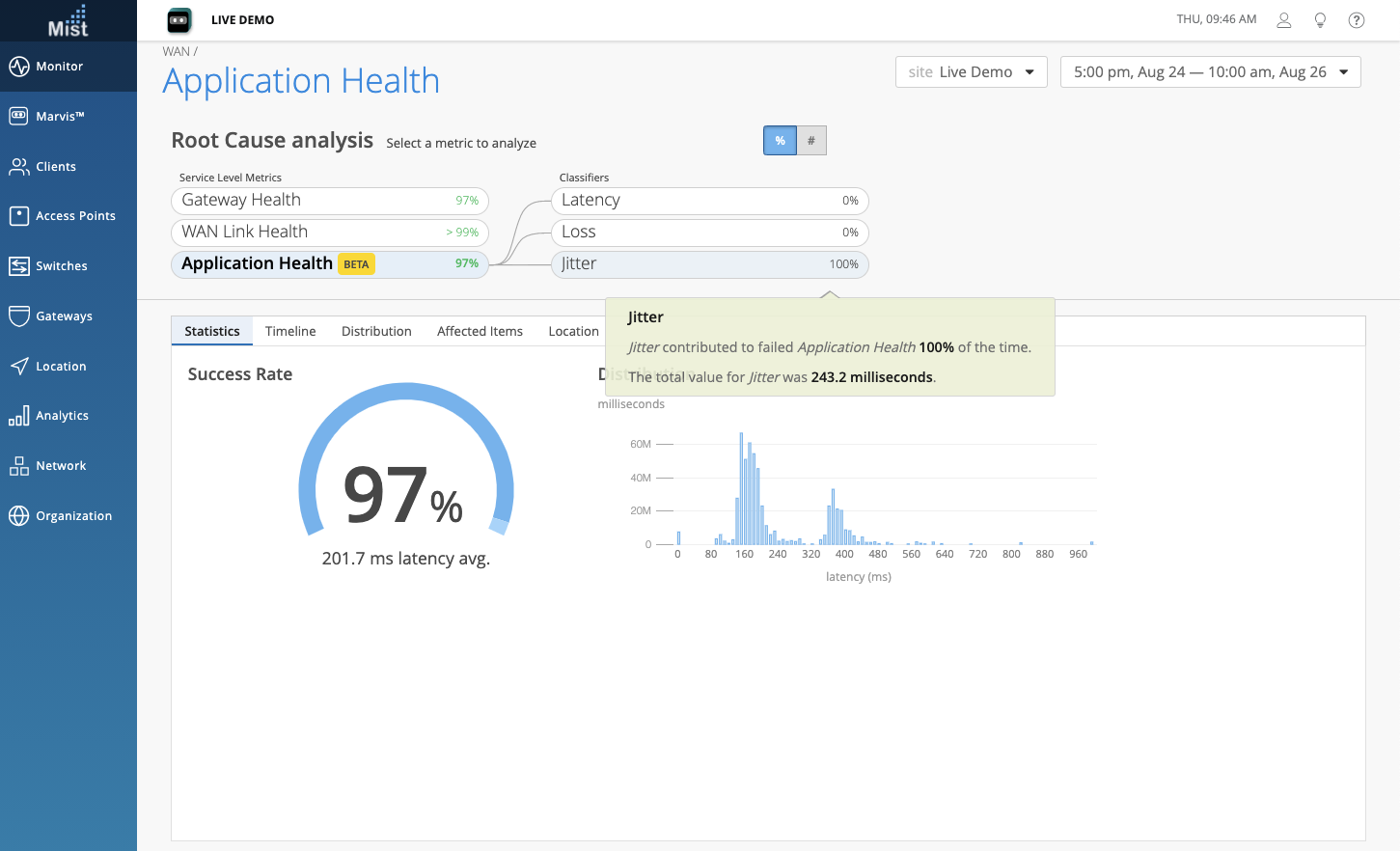 The Application Health SLE is tracked using three Classifiers: Loss, Jitter, and Latency. In this example, Jitter was the main cause of failures in Application Health: