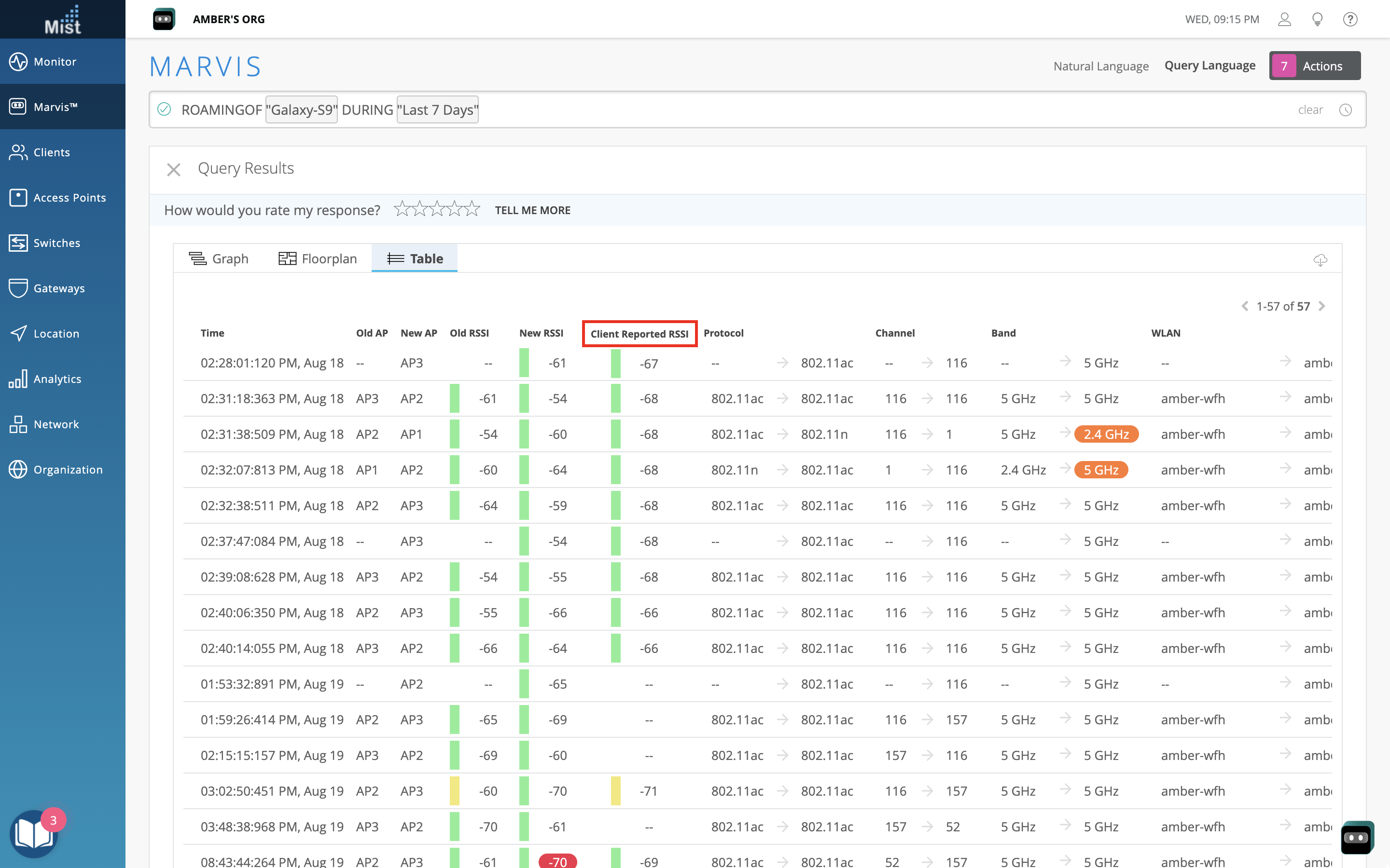 With Marvis Android clients, you have expanded visibility into how the client device sees the Wi-Fi environment. This week we are adding a Client Reported RSSI column in your roaming data when querying Marvis for roaming of a client. To view the client roaming visualization, use the “ROAMING OF” query as demonstrated here: https://www.juniper.net/documentation/us/en/software/mist/mist-aiops/topics/concept/marvis-client-roaming-visualization.html