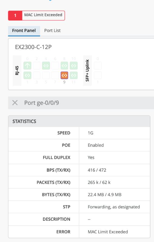 If the maximum number of MACs have already been learned, then the frames are dropped and logged for any additional MACs. You will see a warning on the switch page and a corresponding event on the Insights dashboard when the MAC limit is exceeded: