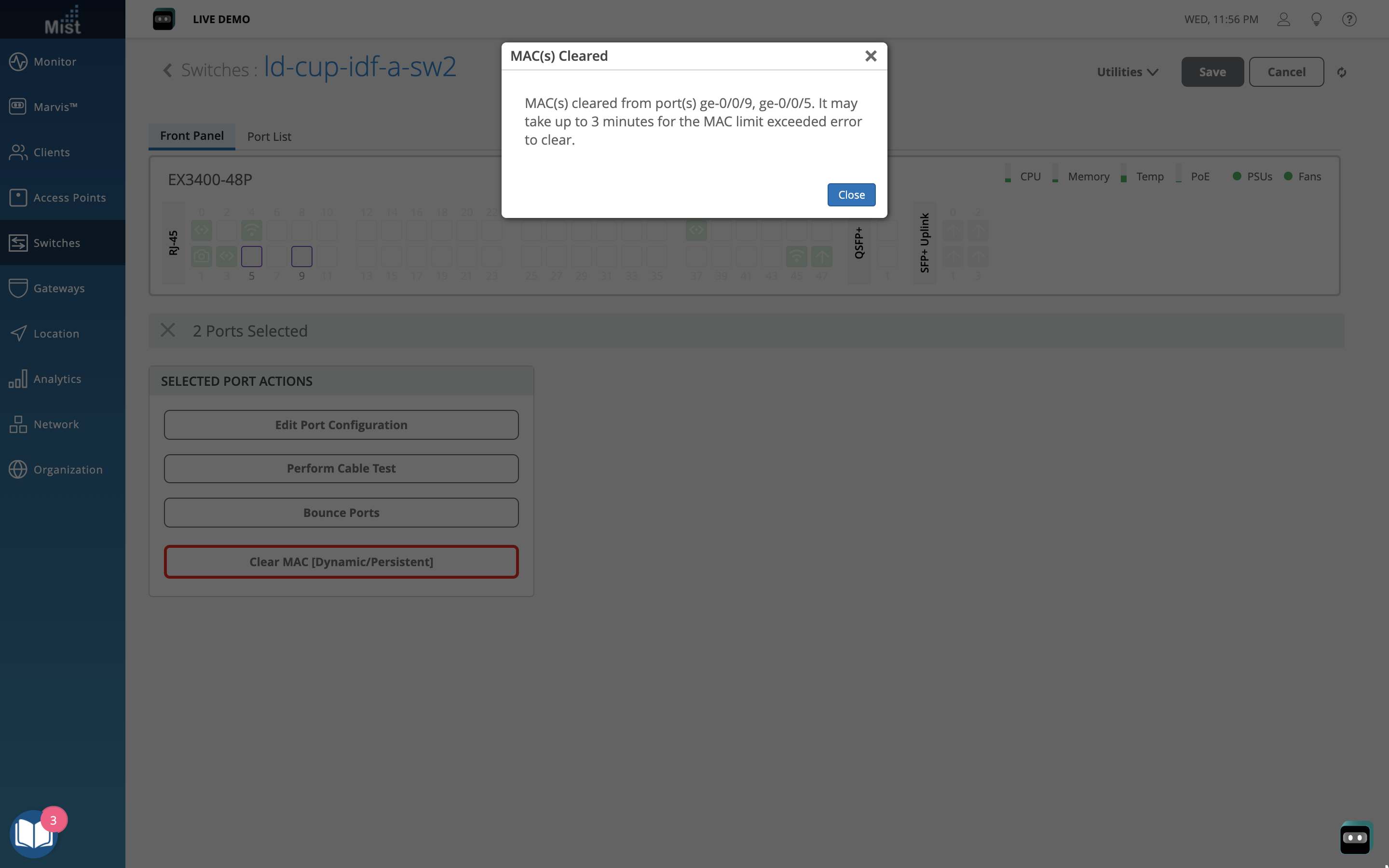 To clear out all dynamically learned MAC addresses, select your ports from the switch front panel and choose the Clear MAC (Dynamic/Persistent) option in the Port Actions. The action will take approximately 3 minutes, and after that your learned MACs will be cleared. Please note that if during the reset a device is still connected on the interface, its MAC address will be dynamically learned after a few minutes.