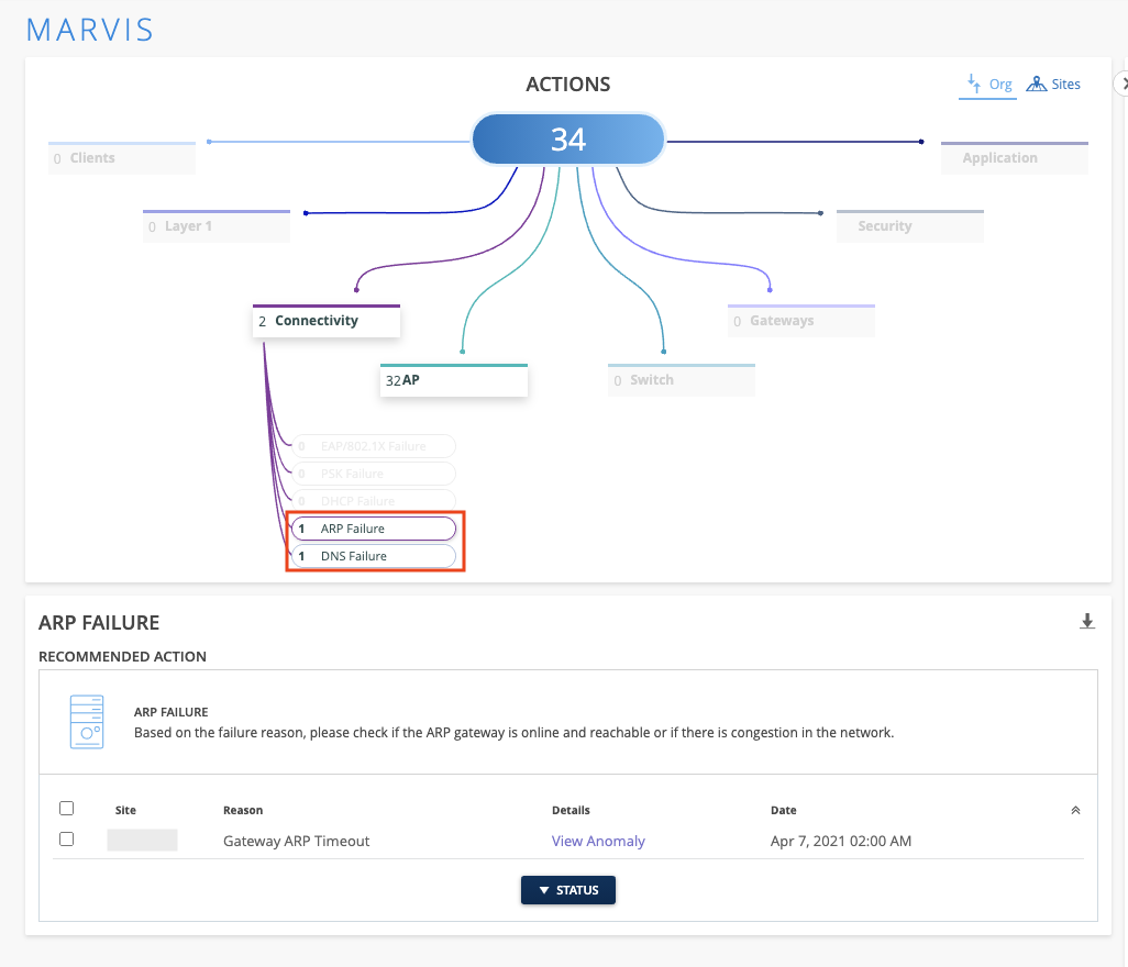 This week we are bringing you two new Actions in the Connectivity section of the Marvis Action Dashboard – ARP Failure and DNS Failure. These two Actions make use of our Anomaly Detection model to identify sites with clients experiencing an unusually high number of failures for ARP and DNS events. You can access the Anomaly Detection details card directly from the Action Dashboard page to see a timeline of failures as well as the impact of APs, WLANs, and Radio Bands to pinpoint the source of the issue.