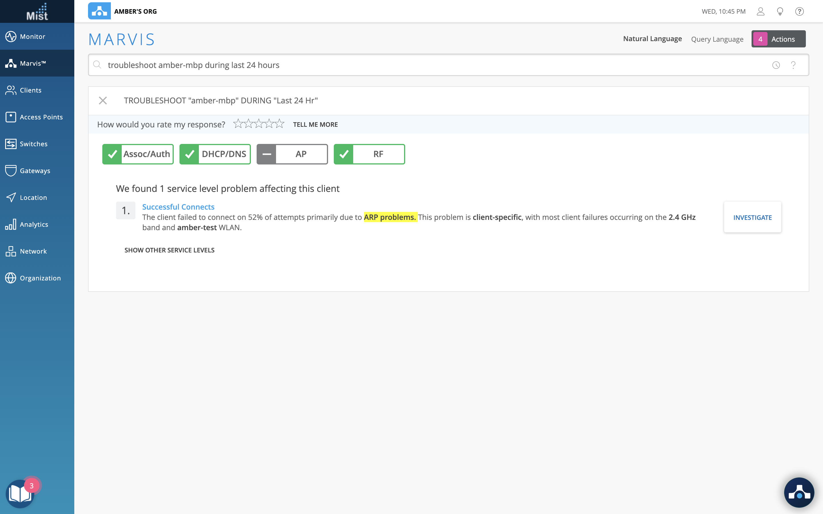 Troubleshooting DHCP and ARP issues on your site just got easier with the introduction of these search queries in our Marvis Search bar. See if clients on your site are experiencing DHCP or ARP issues by simply using the Troubleshoot <Client> search query. These issues may be impacting your site and will cause failures seen on the Successful Connects SLE. Here are the types of DHCP and ARP failures we can detect in the Marvis search: