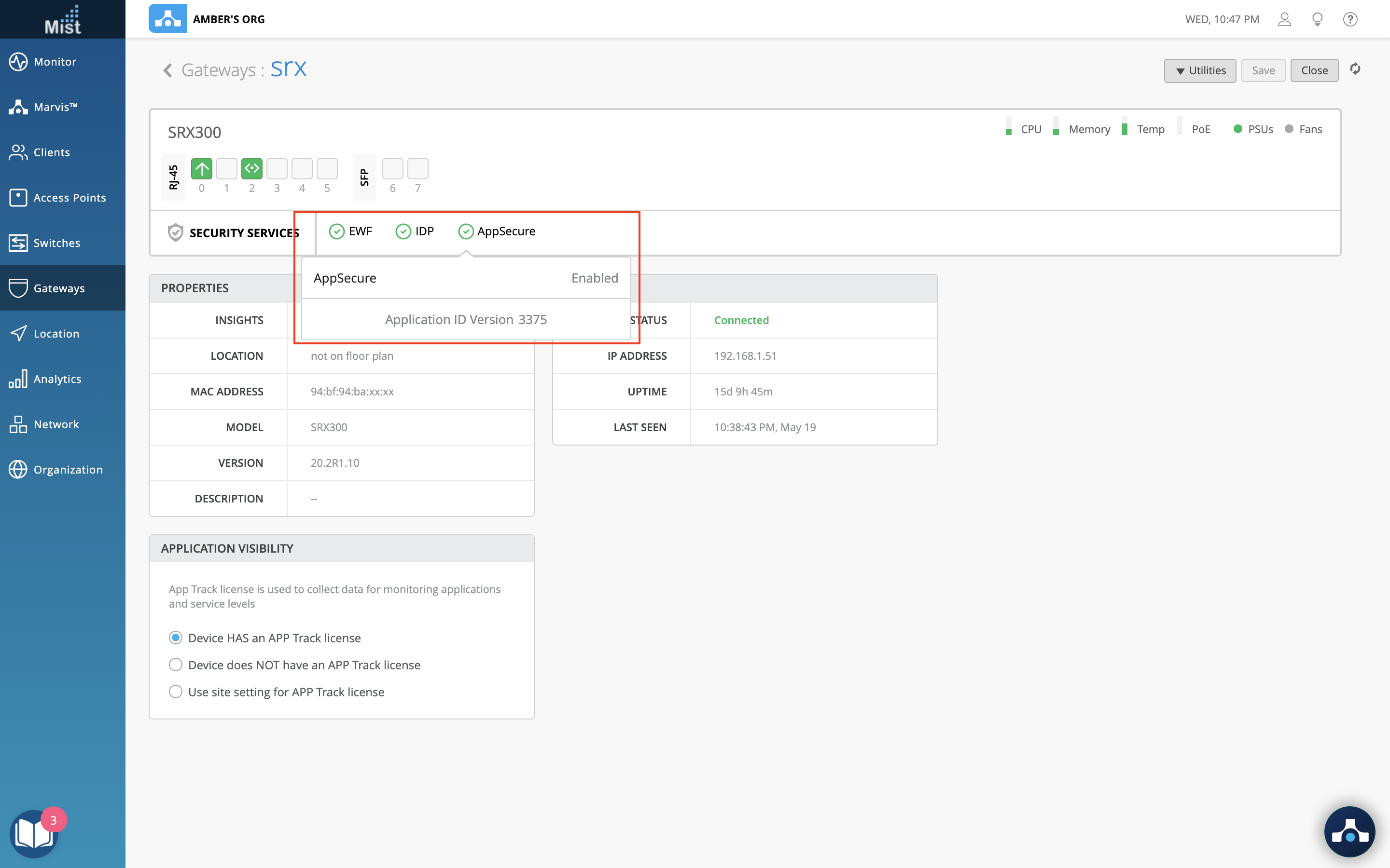 To provide better visibility for your SRX Gateways, we have added Service Status indicators for EWF, EDP, and AppSecure. This allows you to quickly glance and see if the licenses needed are present, and the status of each of these services. You can find the service status indicators on your Gateways page right underneath the port configuration table: