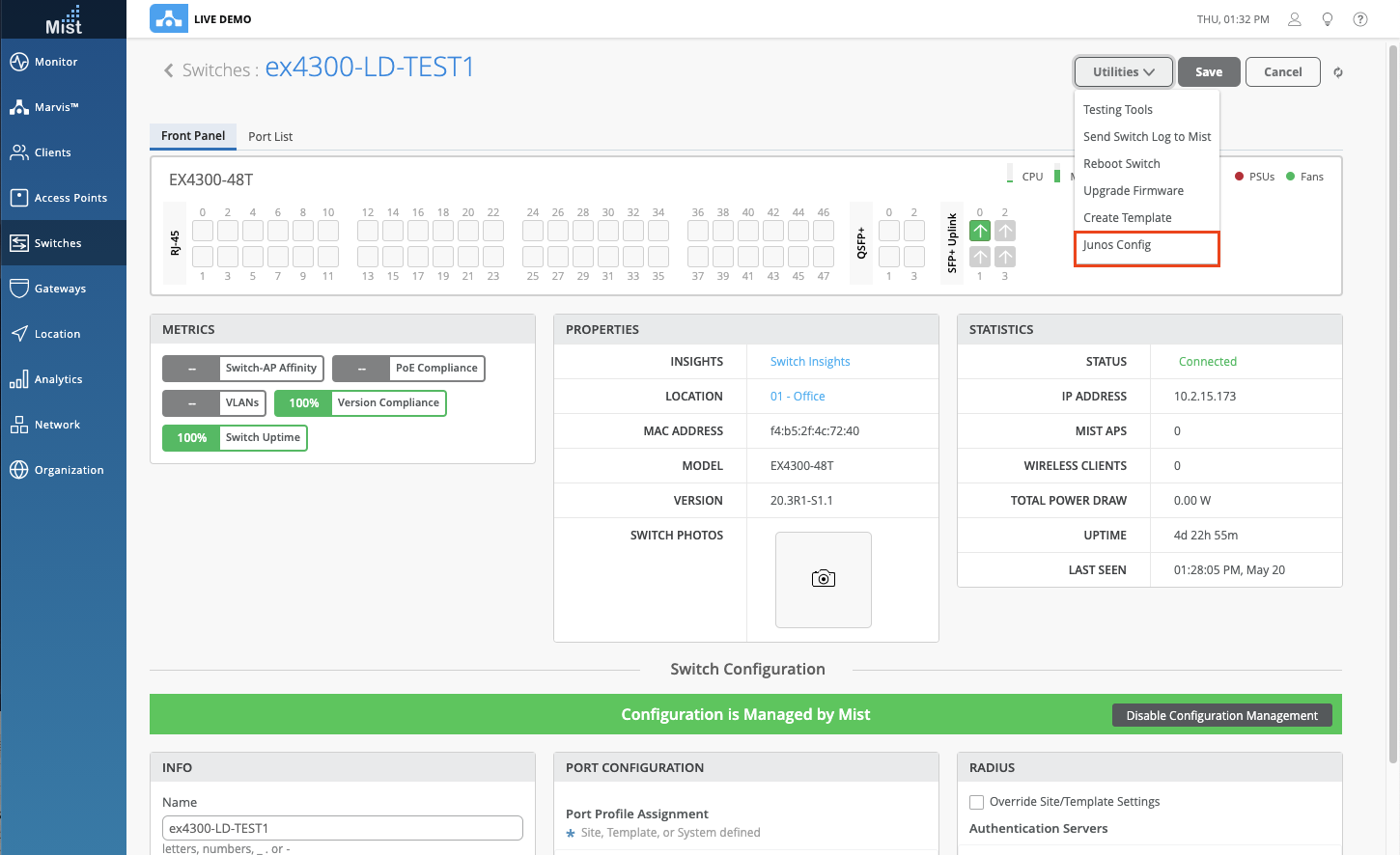 Access the switch configuration file in the Switch Details page by selecting Junos Config in the Utilities drop down menu. The Junos Config file returned will be the intended configuration of the switch.