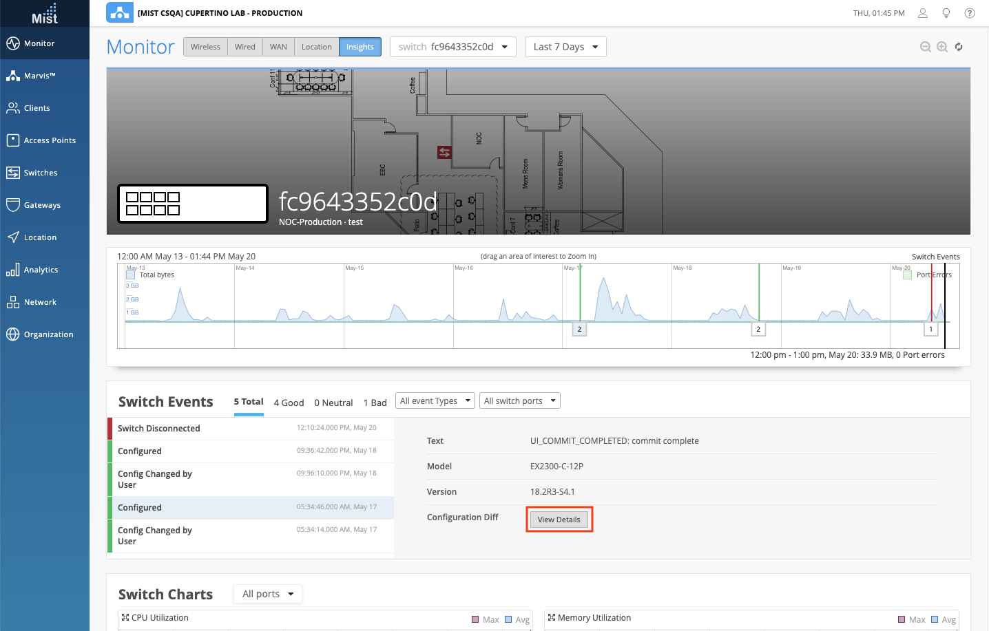 To view your Configuration Diff, navigate to Monitor > Service Levels, select the Insights tab, and use the dropdown menu to select your desired switch. In the Switch Events section, click on a Configured event and click the View Details button to see what configuration changes were made.