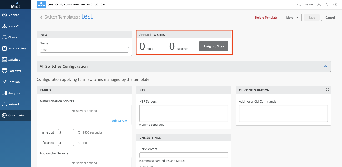 To help improve the flow of configuring and applying Switch Templates, we have added the ability to apply switch templates to sites directly from the Switch Templates page. Before, we required you to first Create or Import a switch template, and then navigate to the Network > Switch Configuration page to assign that template to a site. Now we have simplified the workflow by allowing you to apply your switch template from the same page where you created or imported your template. Please note that we did not remove the ability to assign sites in the Switch Configuration page – we simply added this ability onto the Switch Templates page.