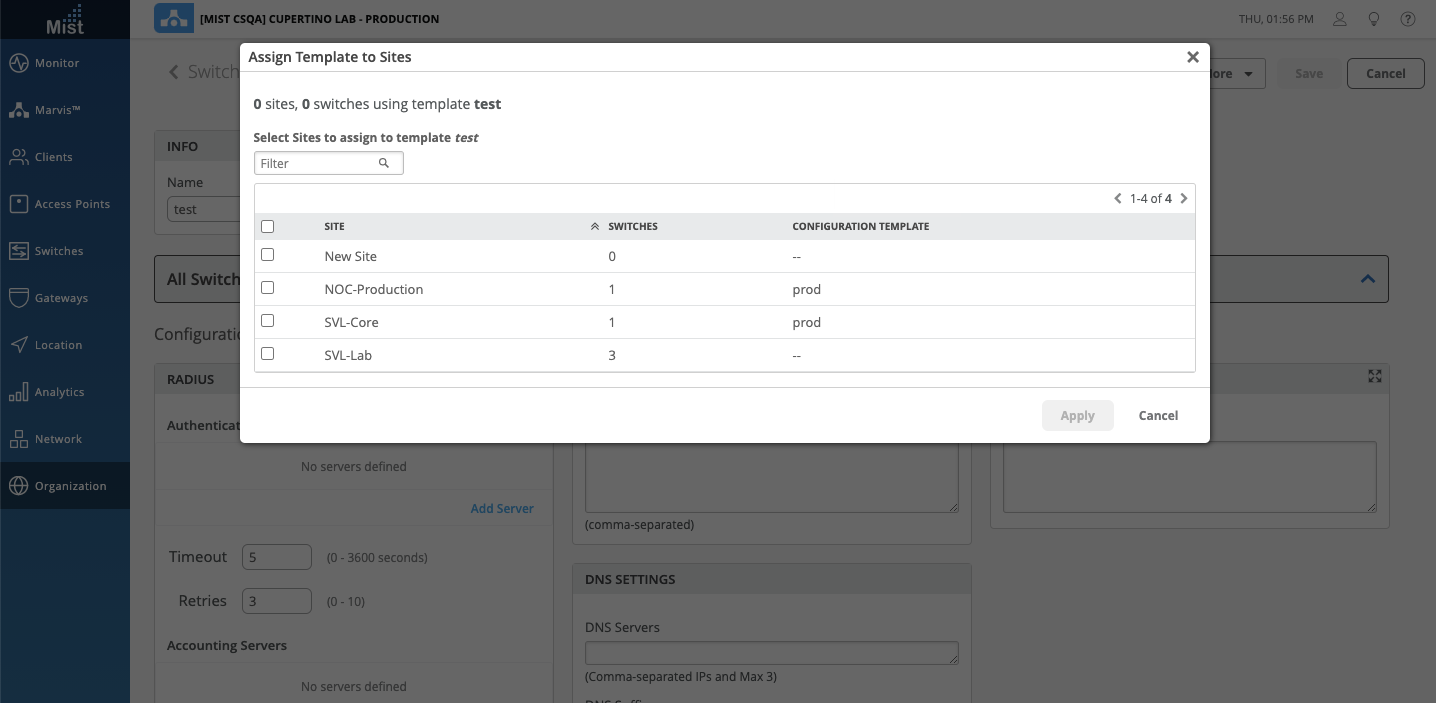 In the Switch Templates page (Organization > Switch Templates), you can now use the Assign to Sites function when viewing your templates. Use the pop up to easily assign your template to the intended sites.