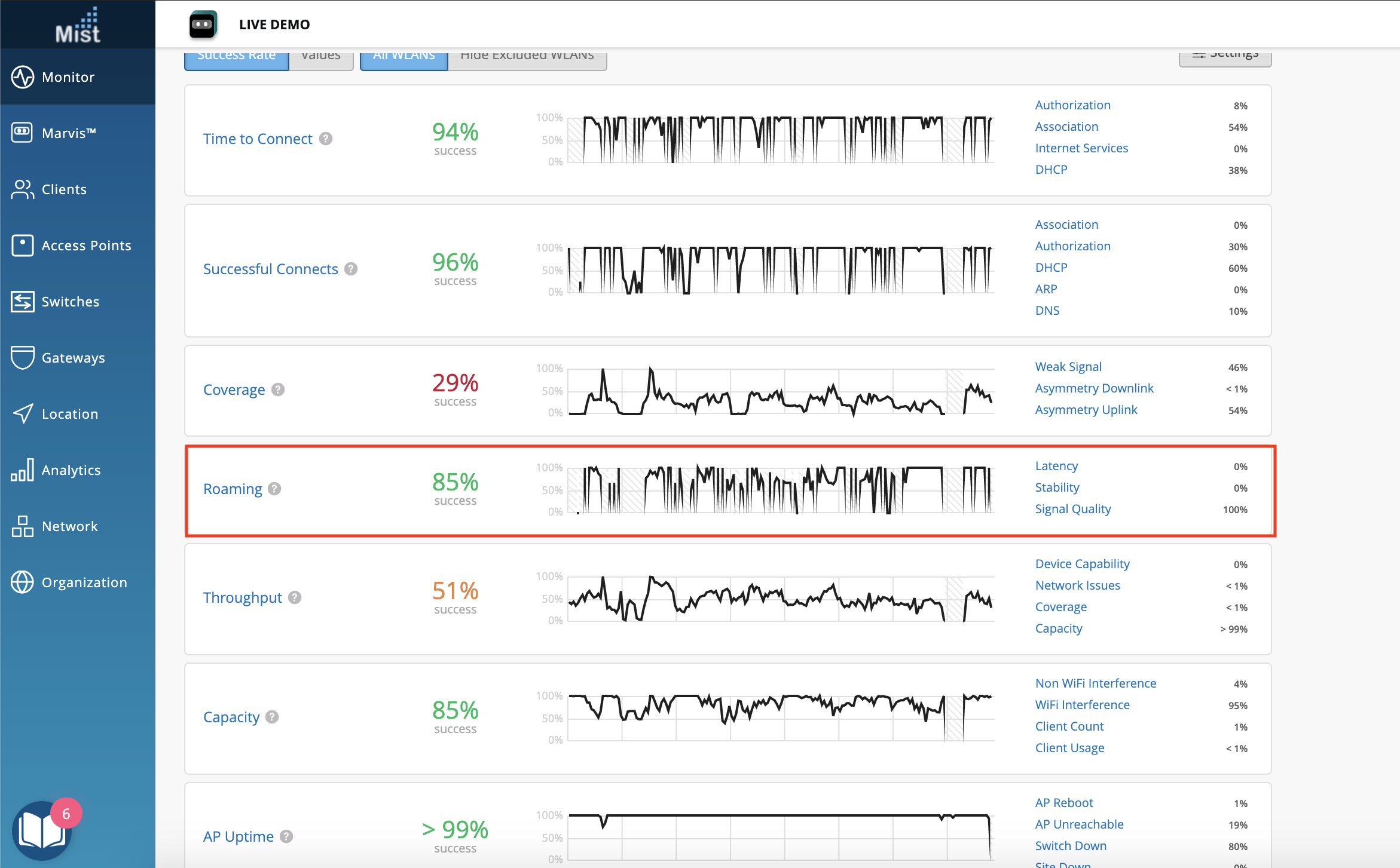 The Roaming SLE tracks the percentage of successful roams between 2 access points for clients that are within the prescribed thresholds. This week we have added new Classifiers and Sub-classifiers to help with sorting through additional roaming data.