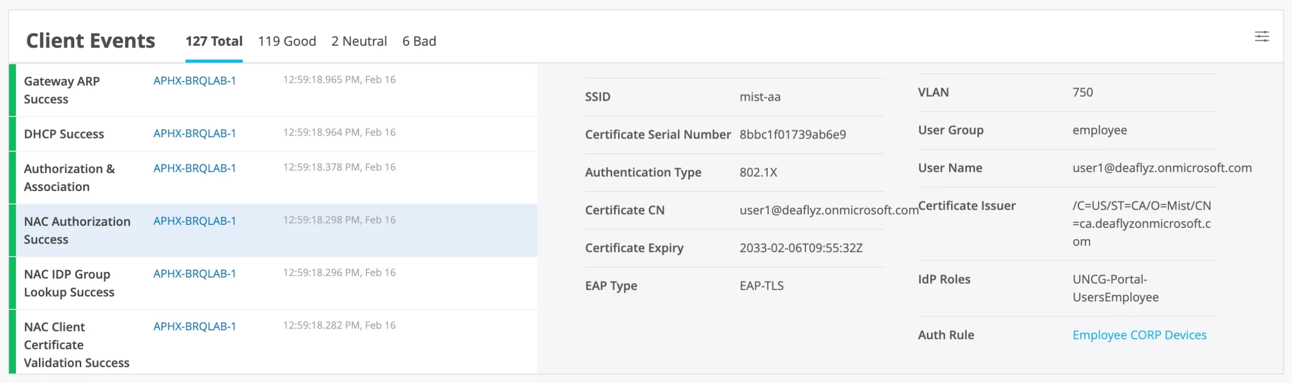 View Access Assurance events inline with Wired and Wireless client events