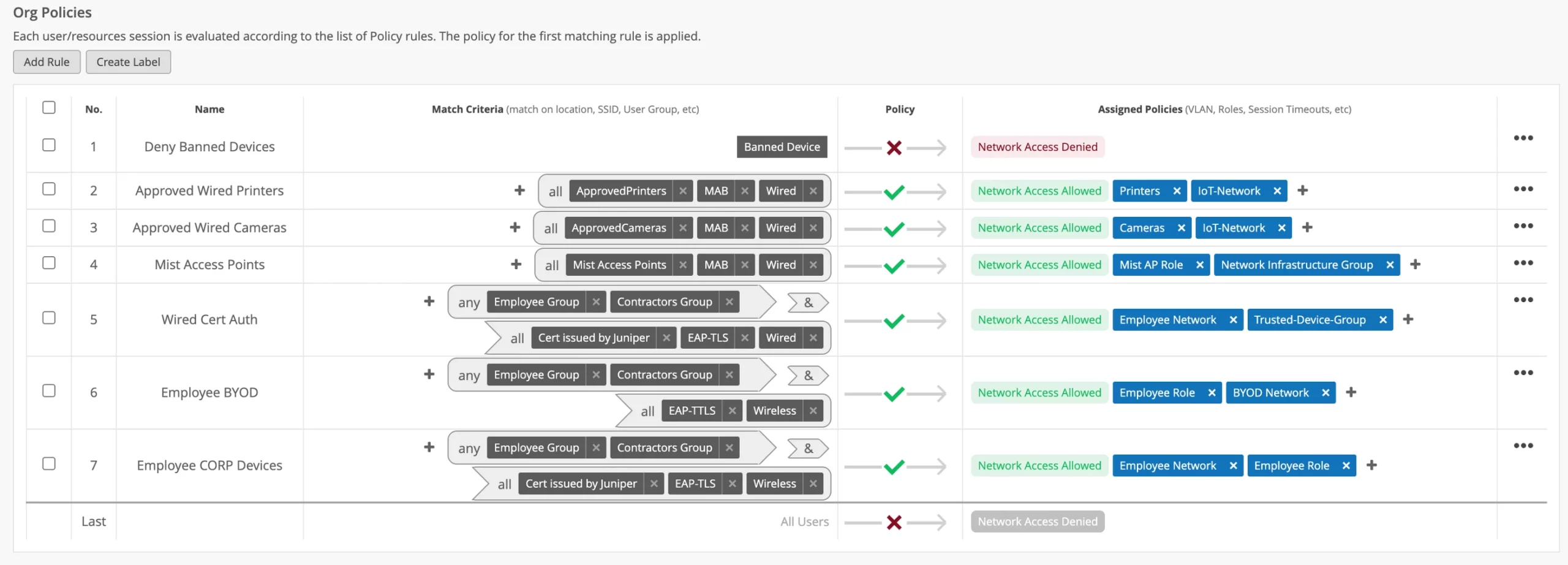 The Juniper Mist Access Assurance service provides secure wired and wireless network access control based on user and device identities. The service enforces zero-trust network access policies for guest, IoT, BYOD, and corporate devices. Cloud-hosted, microservices-based authentication eases IT operations by delivering a full suite of access controls within a flexible yet simple authorization policy framework.